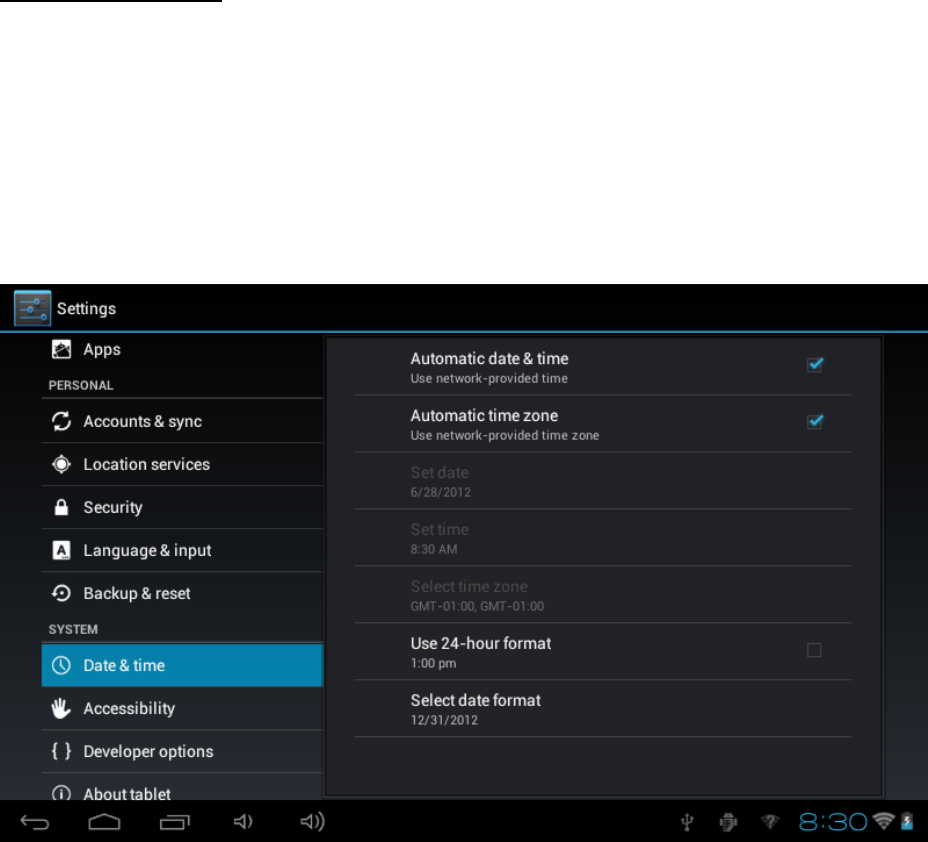 You can setup Automatic date & time, Automatic time zone, Set date, Set time,