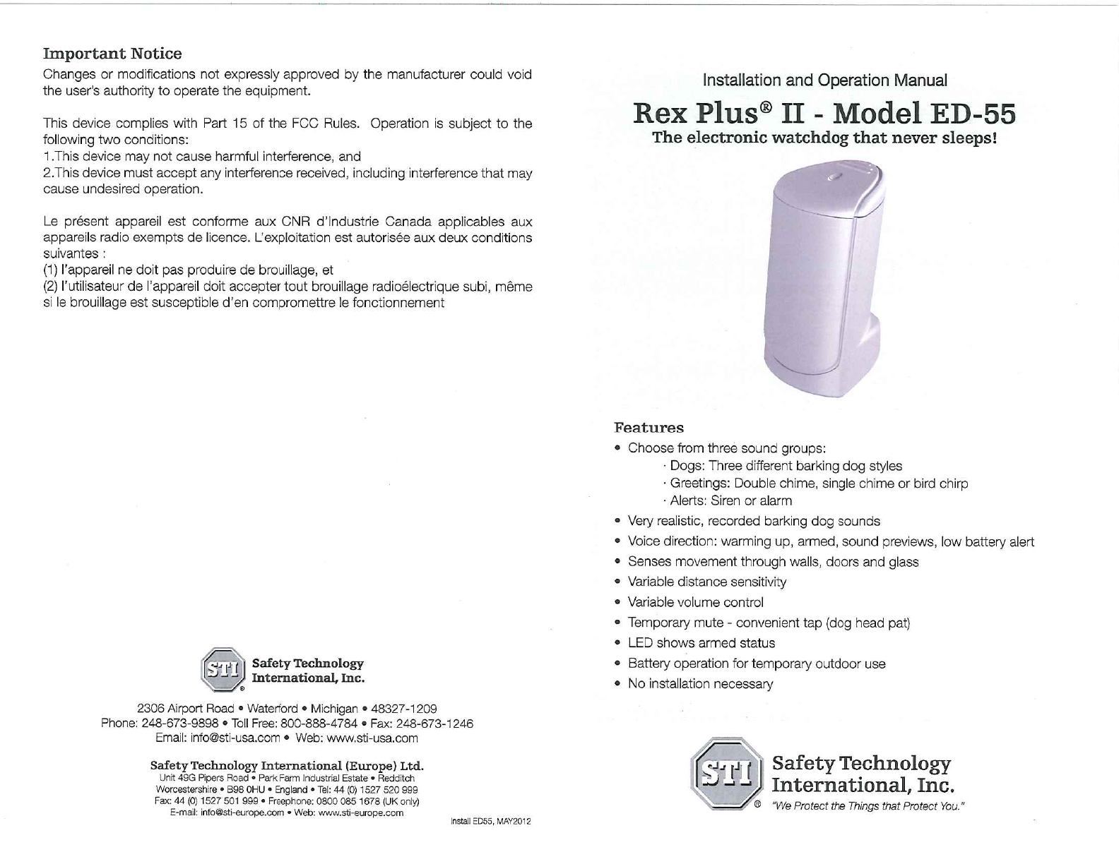 Safety Technology STI-ED55 motion detection device that plays selectable sounds User Manual CERTIFICATE OF COMPLIANCE