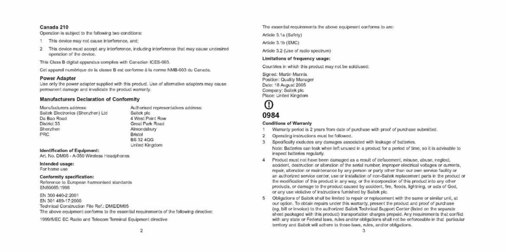 Saitek Electronics DM05-1 Saitek A-350 Wireless Headphone (Dongle) User Manual Print dmeQSGA350