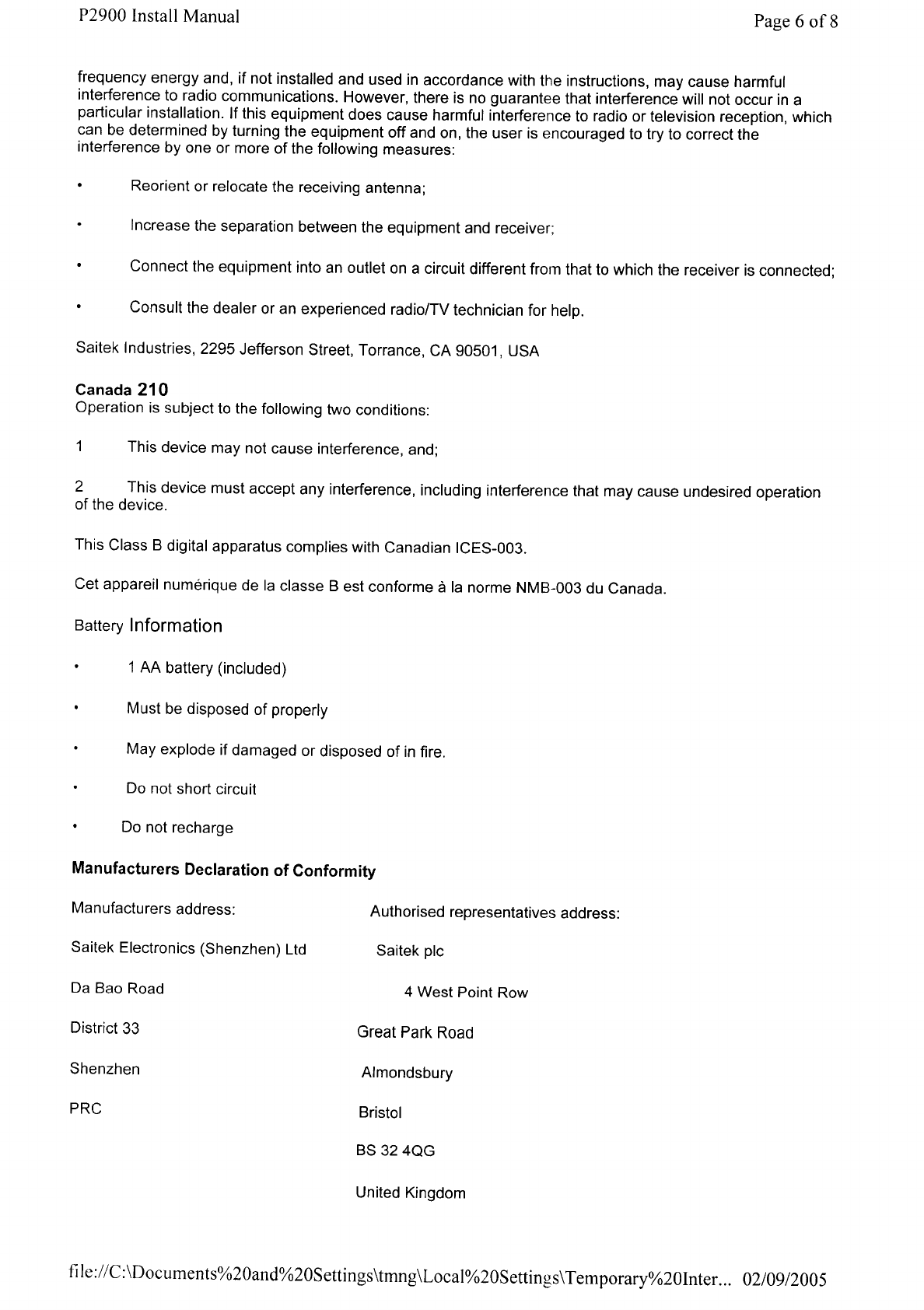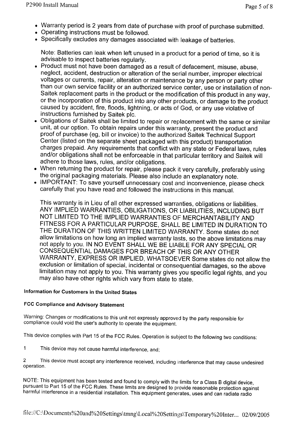 Saitek Electronics PP19-2 P2900 Wireless Pad (Dongle Unit) User Manual