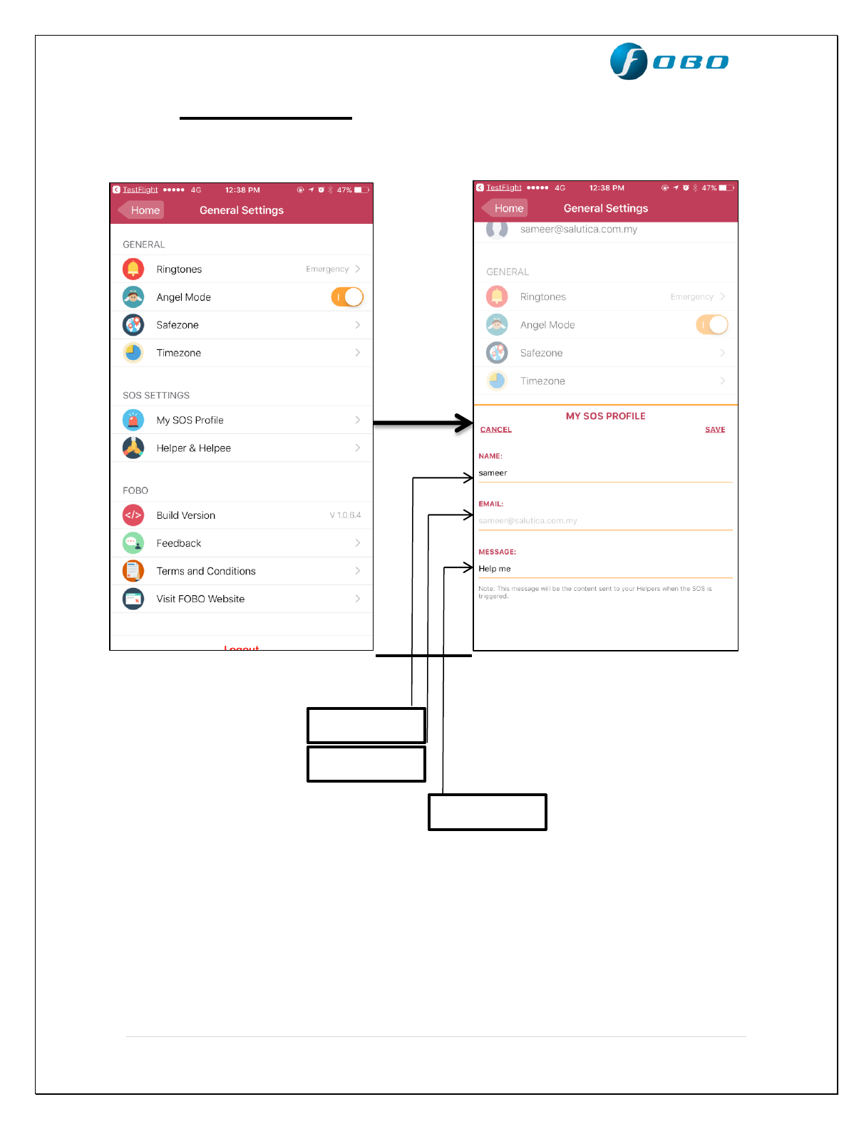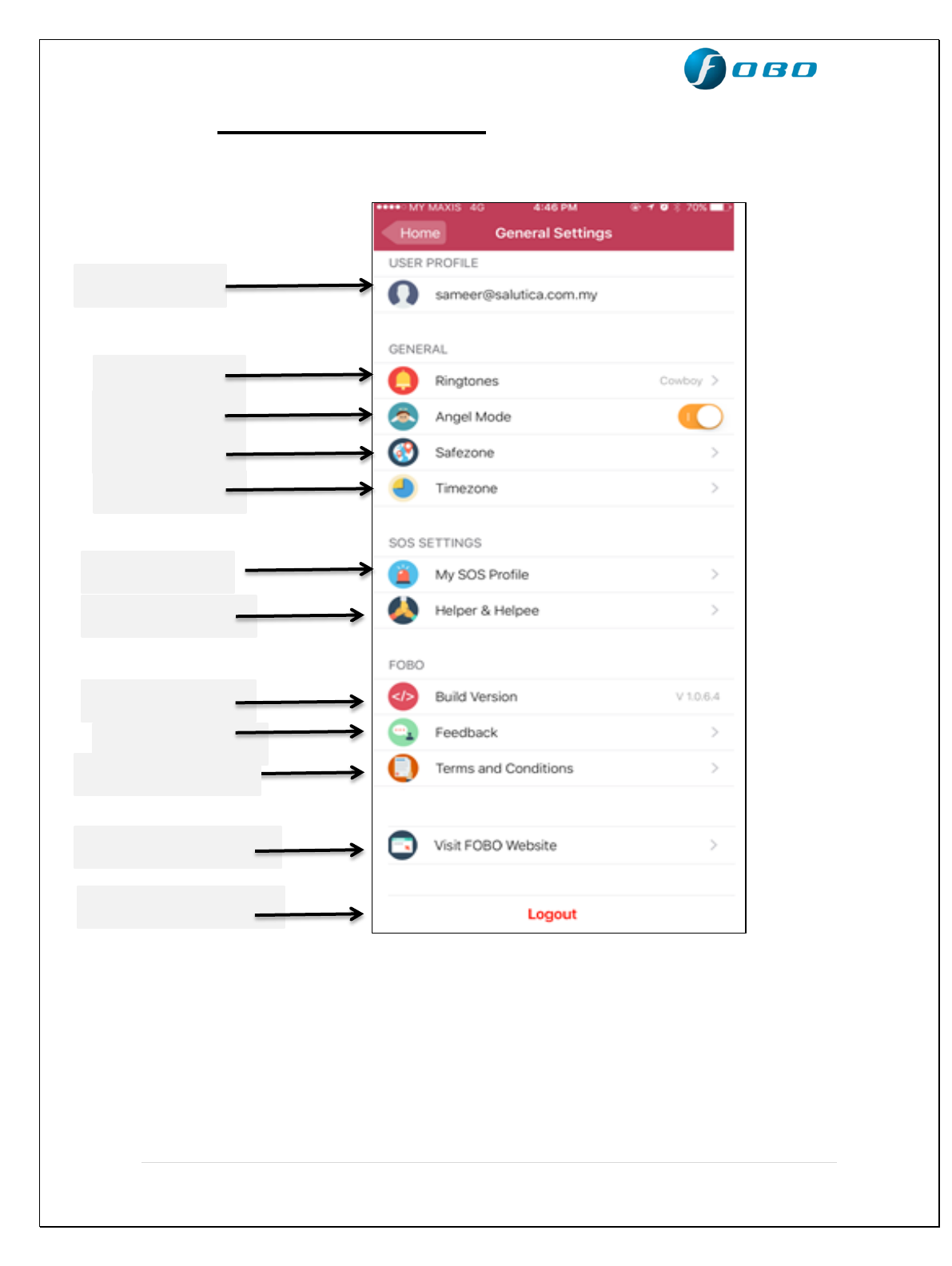 Helper’s “MyInfo” screen in FOBO TAG app for his/her e-mail.
