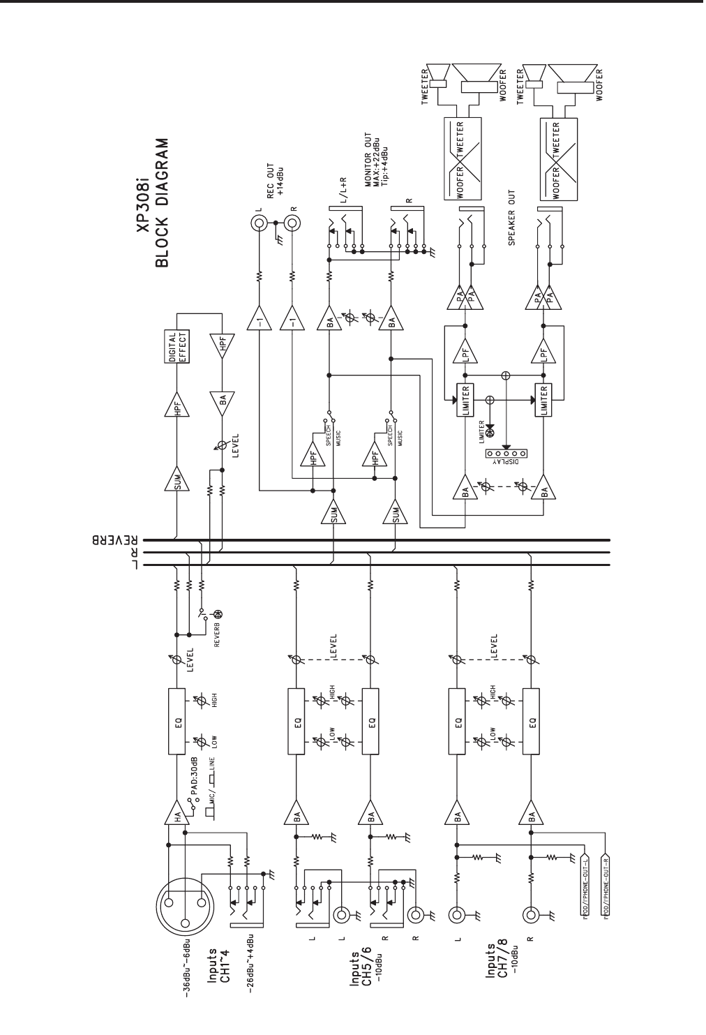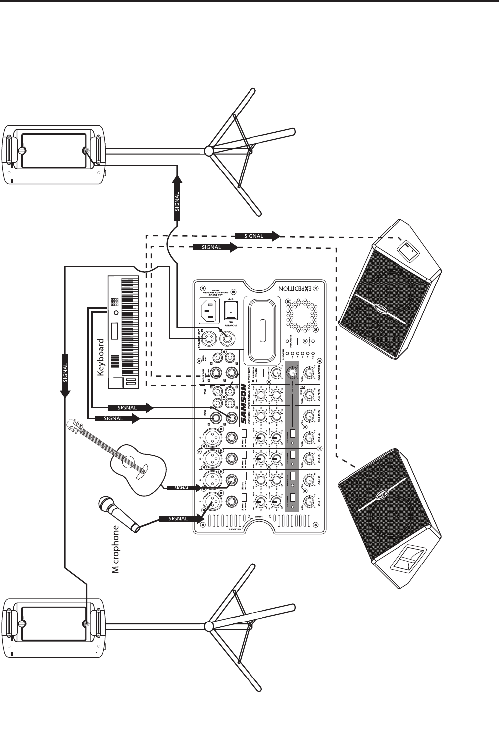 This example shows a typical PA system for a band using the XP308i with microphones, acoustic guitar and keyboards connected. A