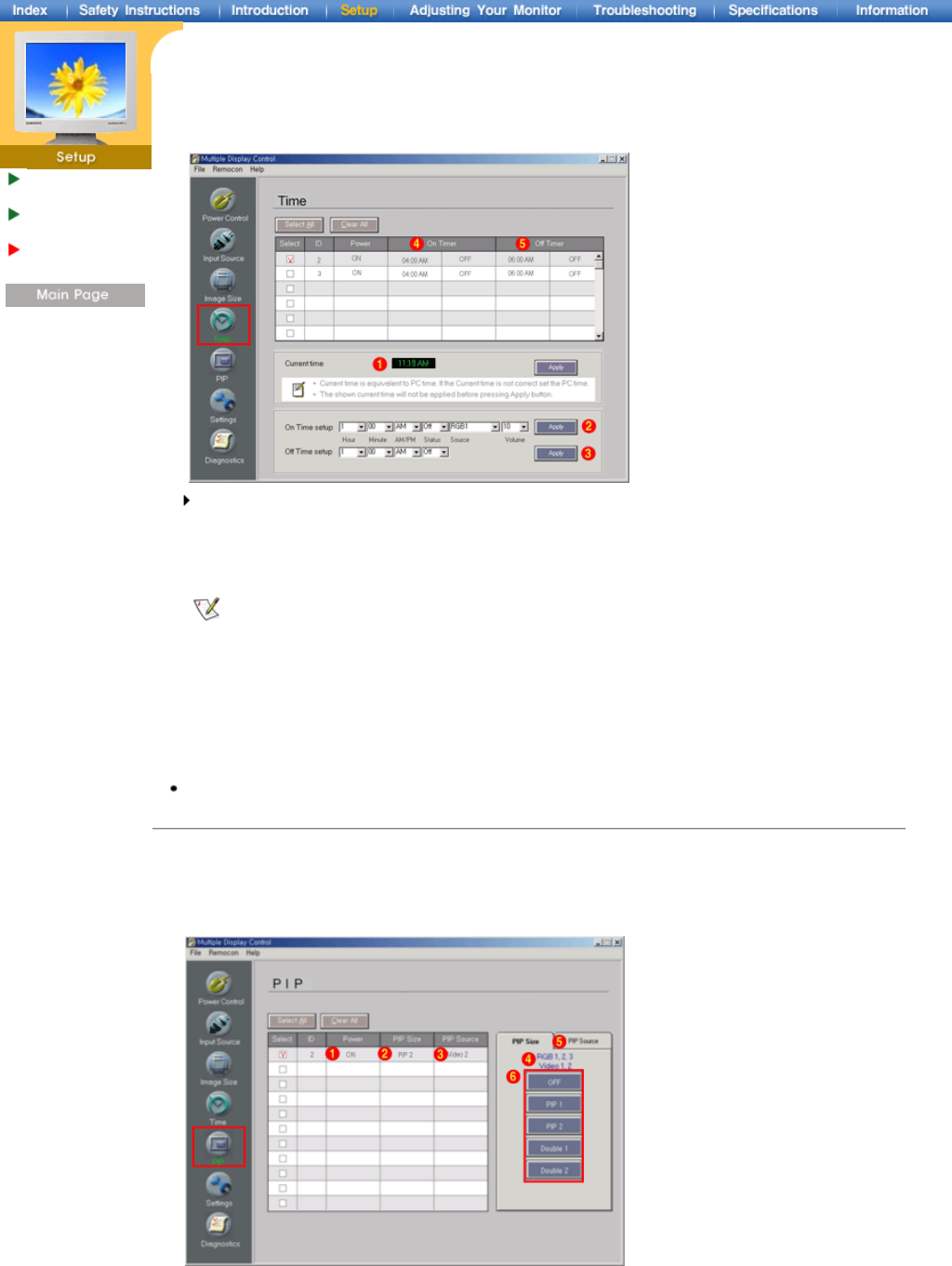 - Set the hour, minute, AM/PM of On Time, Status, Source, volume of the selected display.