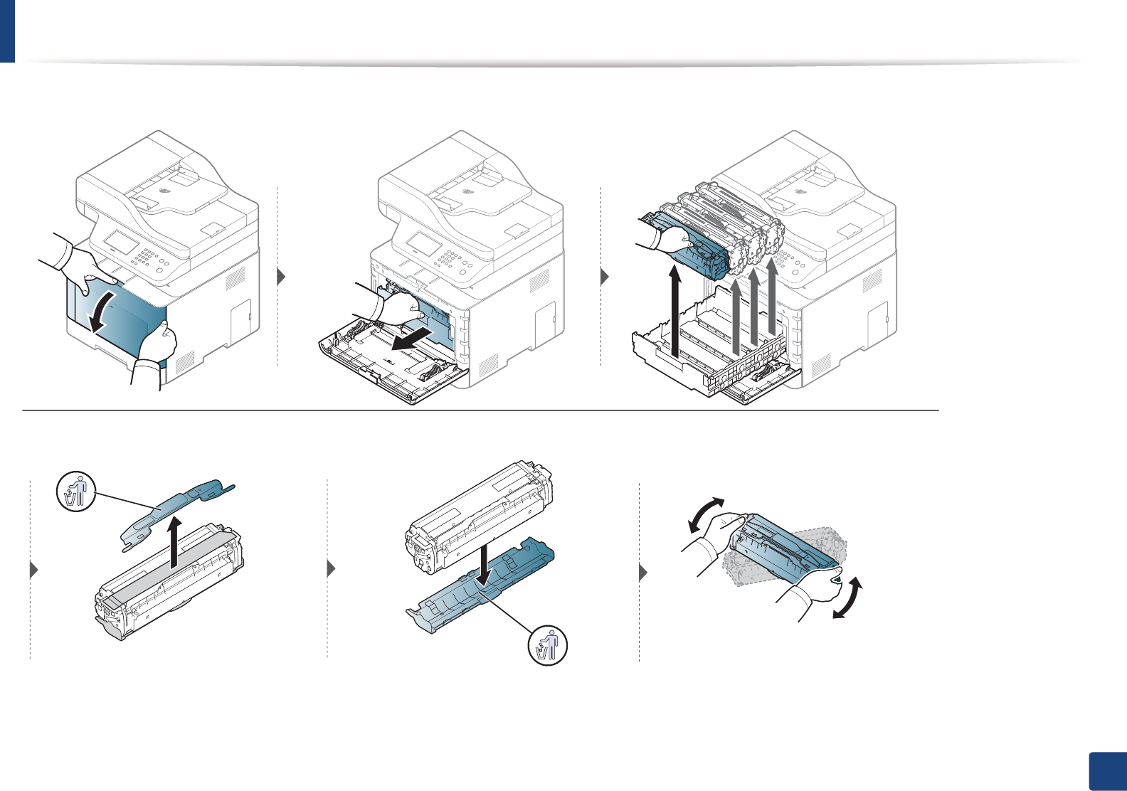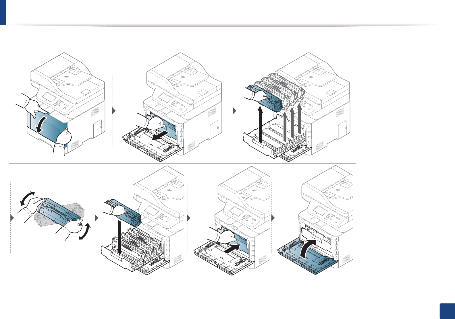 • Toner particles can be released inside the machine but it does not mean the machine is damaged. Contact a service representative when print quality problems