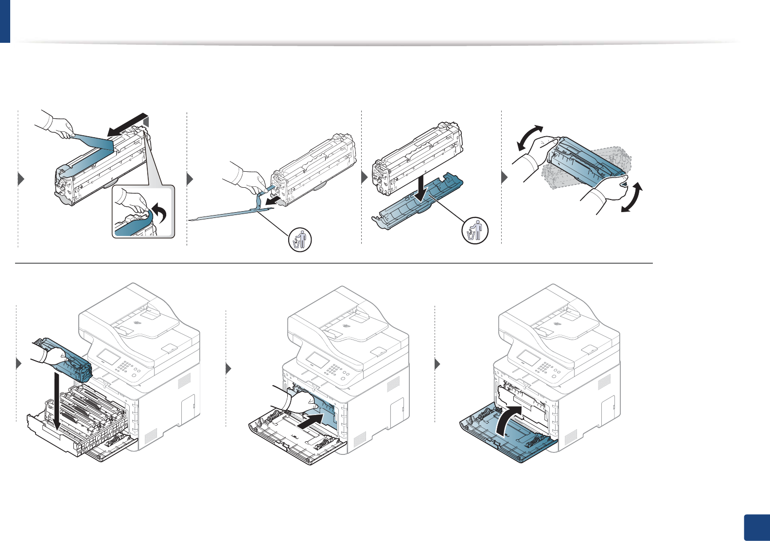 • Do not use sharp objects such as a knife or scissors to open the toner cartridge package. They might scratch the drum of the cartridge.