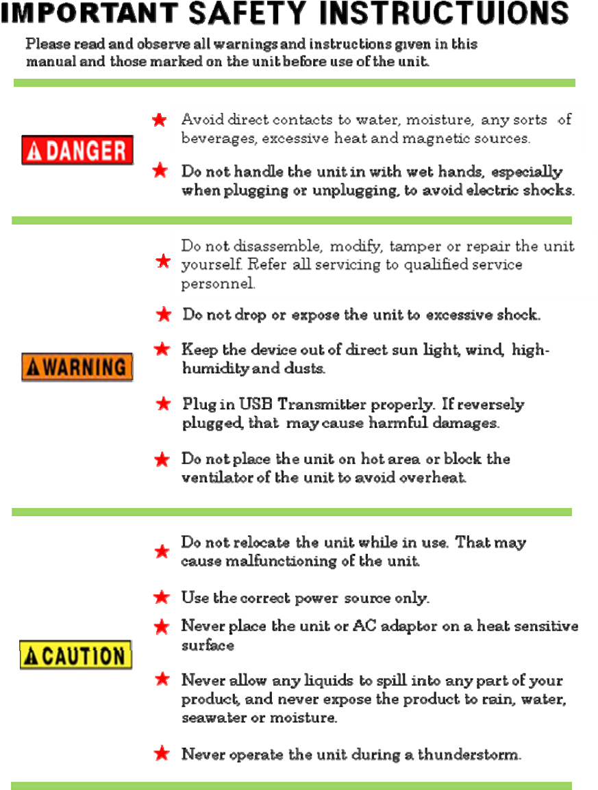 Any obstacle objects should not be between USB dongle and receiver. The operating range is 5~10m