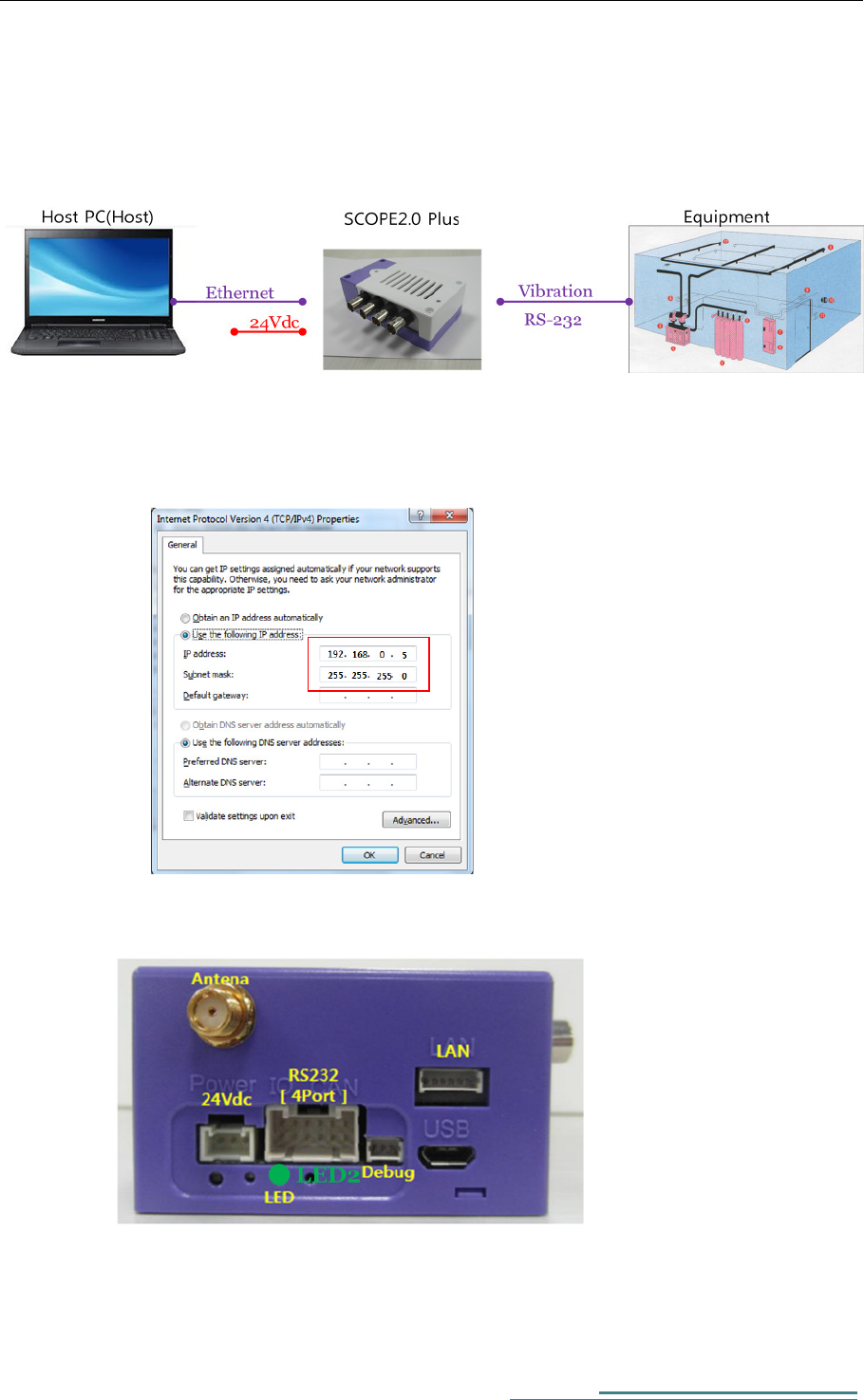 SCOPE2.0 Plus has Power (24Vdc), USB OTG, LAN Port, RS-232 4Port, a