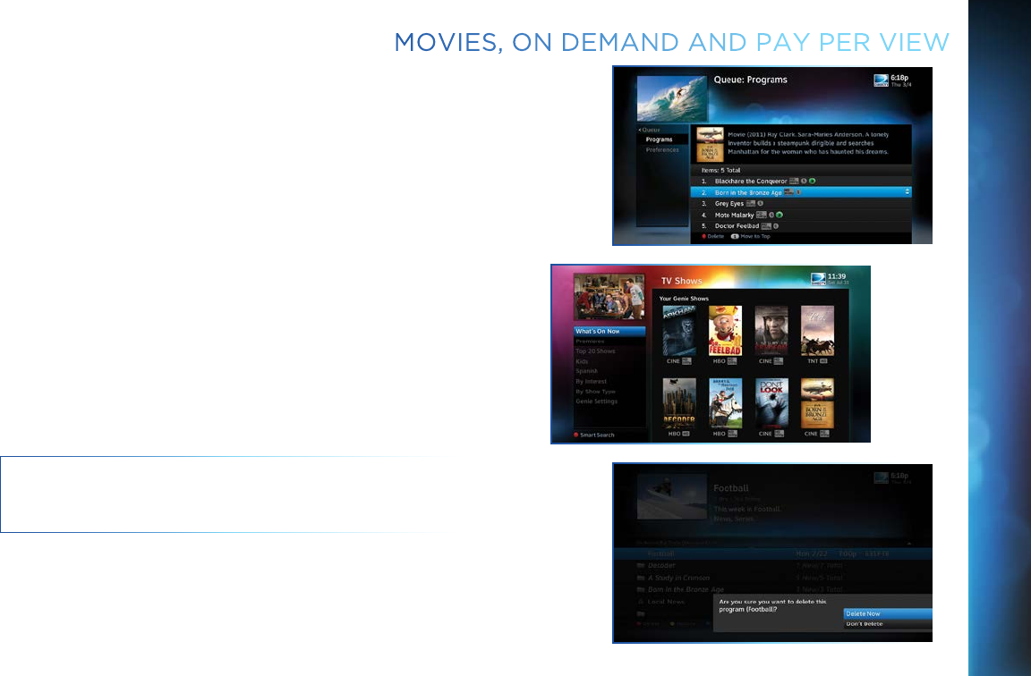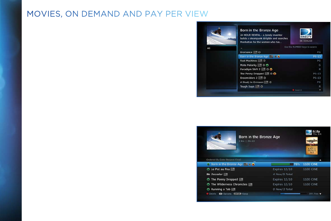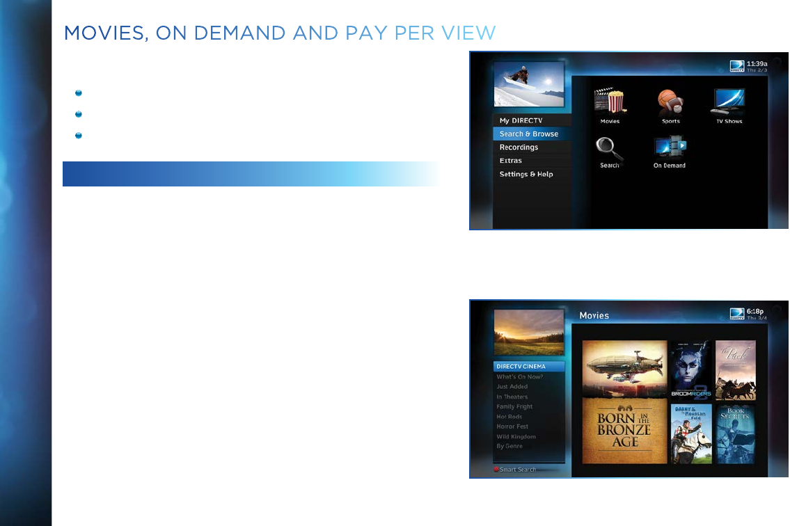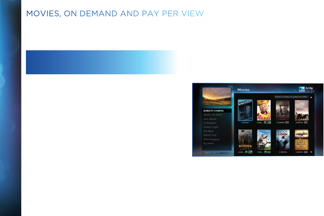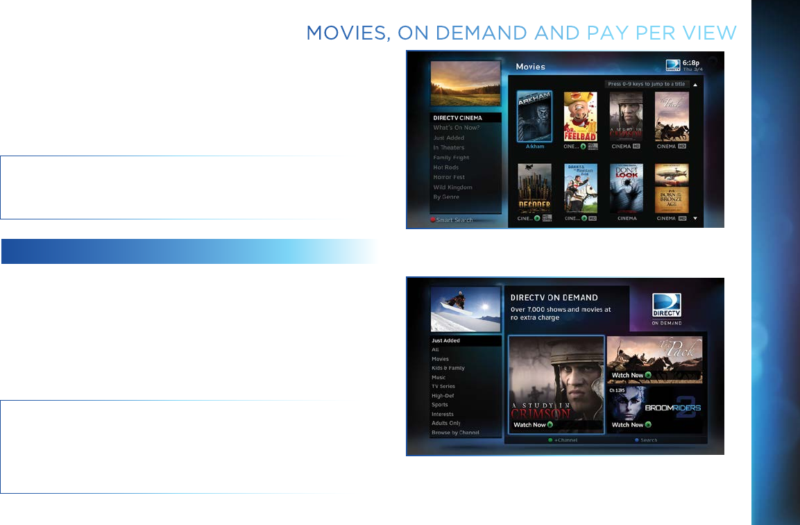 channels of live and On Demand TV programming, satellite music and a huge selection of box office hits from DIRECTV CINEMA®.