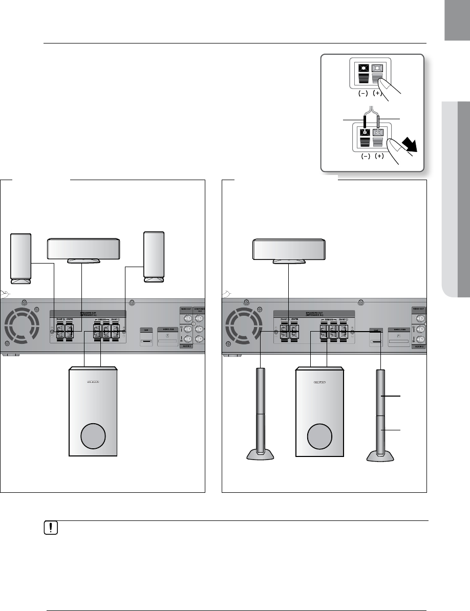 When connecting the speaker wires to the speakers, make sure that the polarity (+/ –) is correct. `