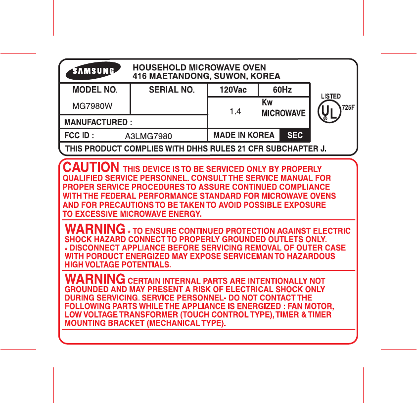 Samsung Electronics Co MG7980 Micro wave Oven User Manual