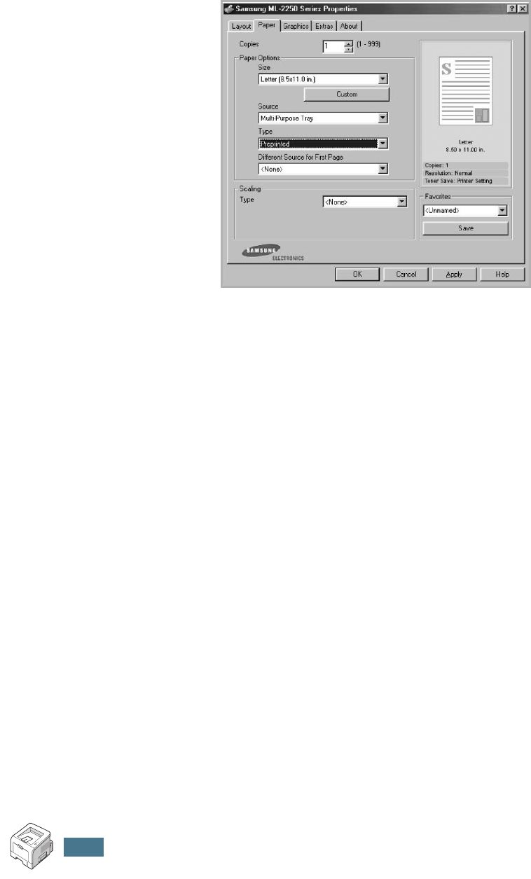 From the Paper tab, select the paper source, size and type.