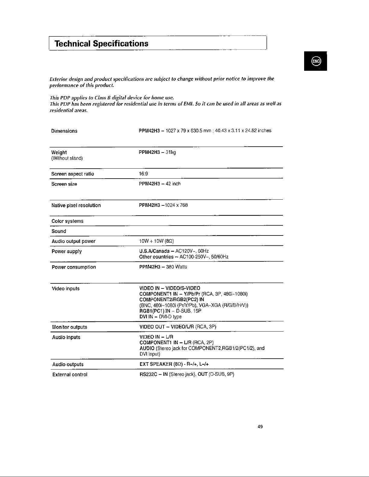 Samsung Electronics Co PPM42H3 42-inch PDP Monitor User Manual