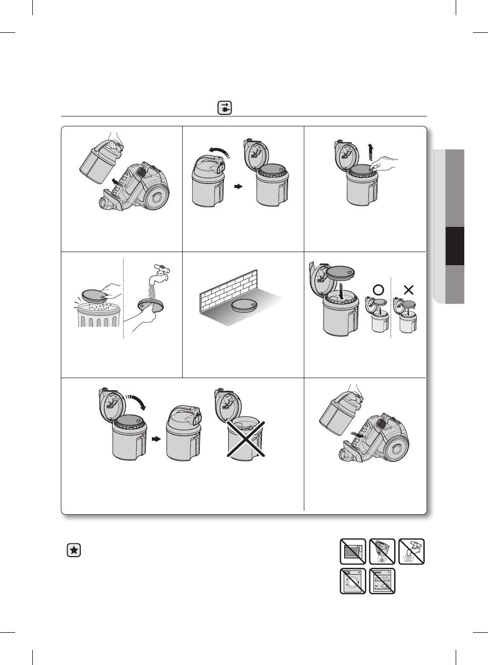 Take the dust bin out. Pull the dust bin cover to open. Remove the filter from the dust
