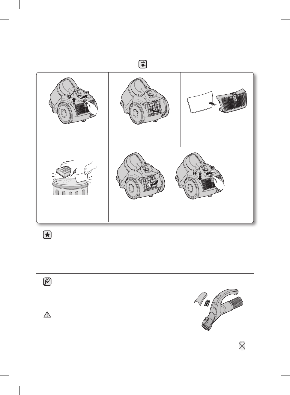 Clean the filter. Put the HEPA filter and frame part into the main body.