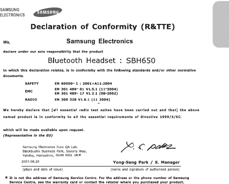 Samsung Electronics Co Ltd Bluetooth Stereo Headset SBH650 cover