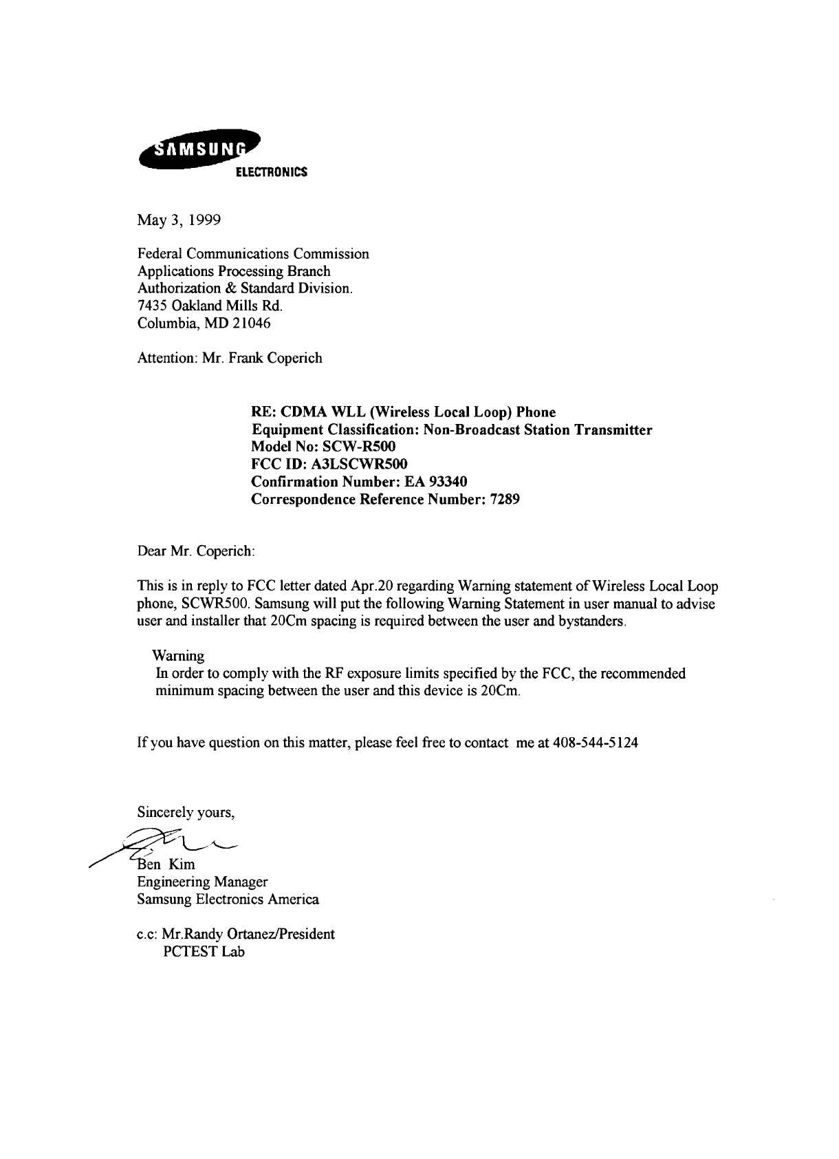 Samsung Electronics Co SCWR500 CELLULAR CDMA WLL TERMINAL User Manual Warning Statement