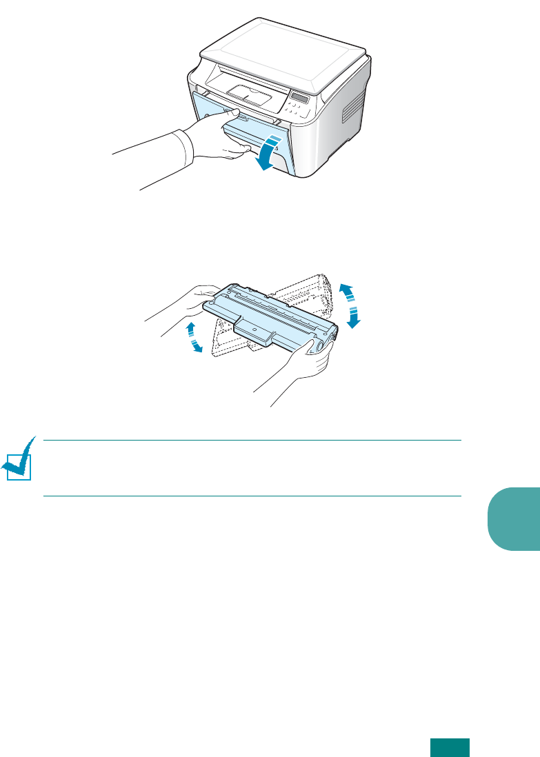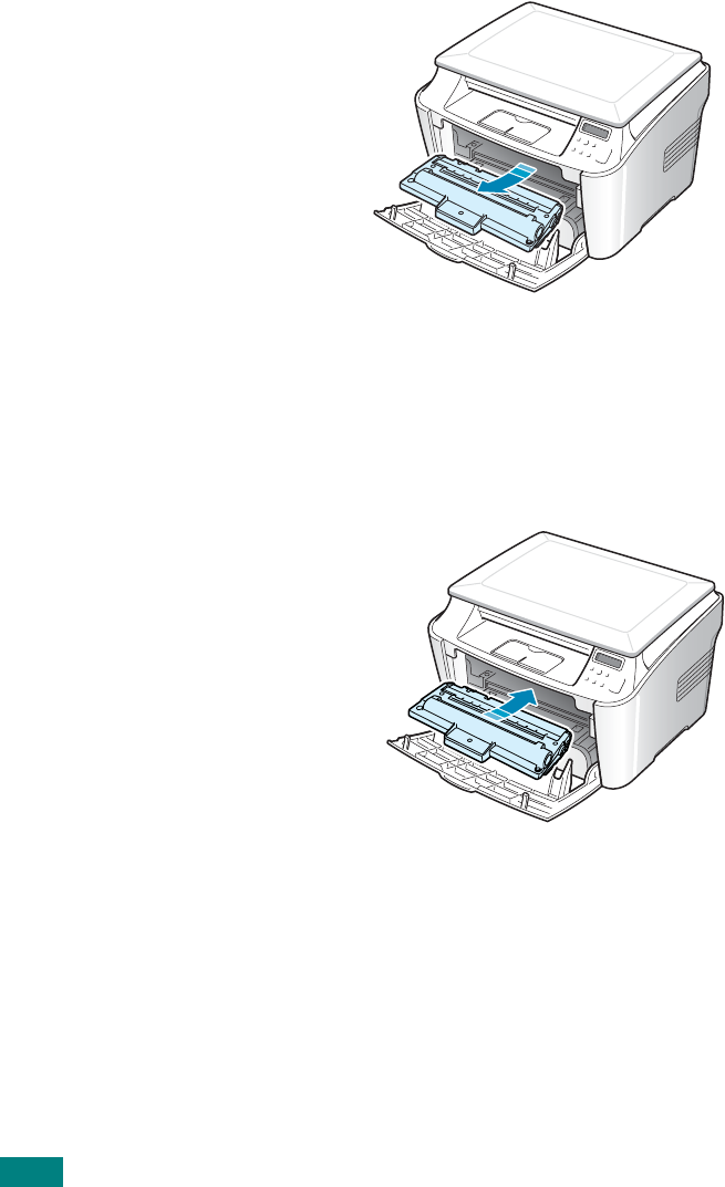 Open the front cover and pull the toner cartridge out,