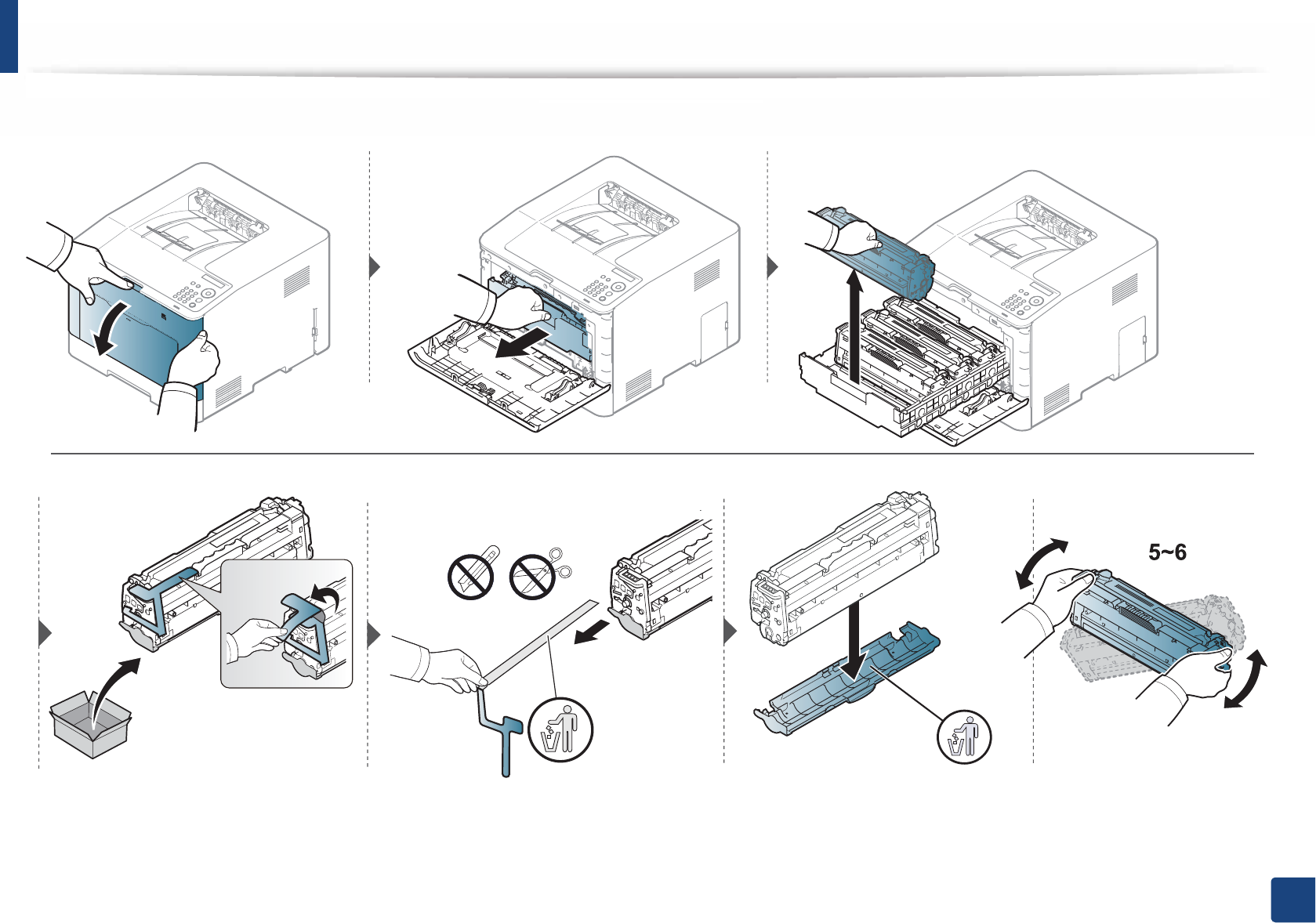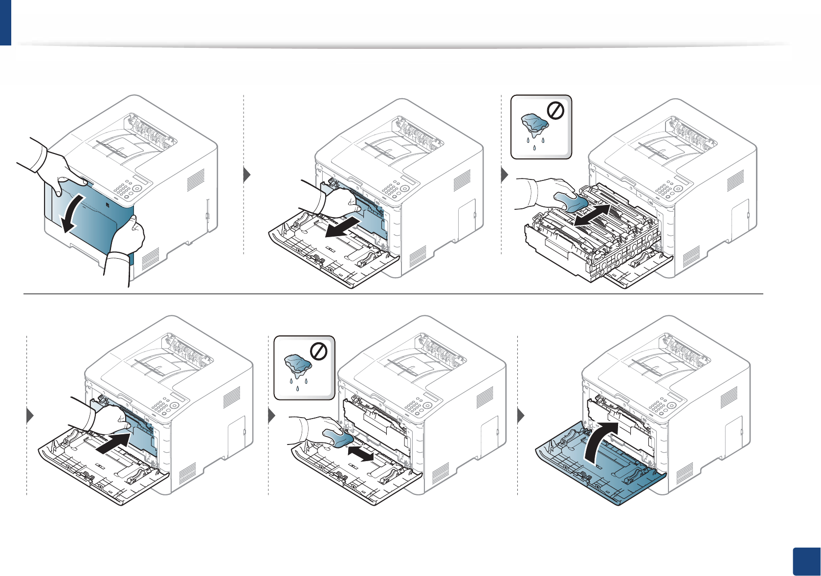• Use a dry lint free cloth when cleaning the inside of the machine, be careful not to damage the transfer roller or any other inside parts. Do not use solvents such