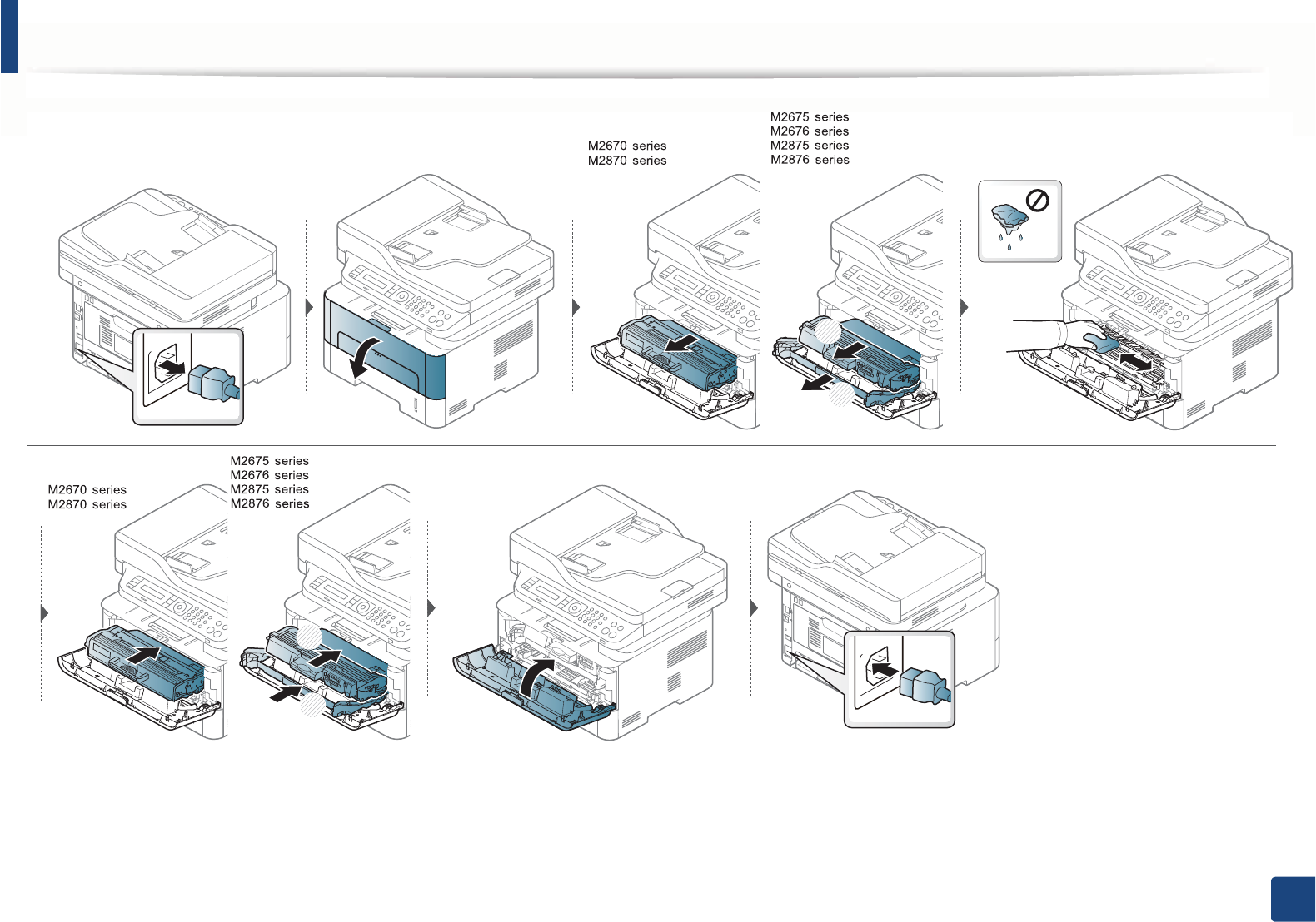 • If toner gets on your clothing, wipe it off with a dry cloth and wash clothing in cold water. Hot water sets toner into fabric.