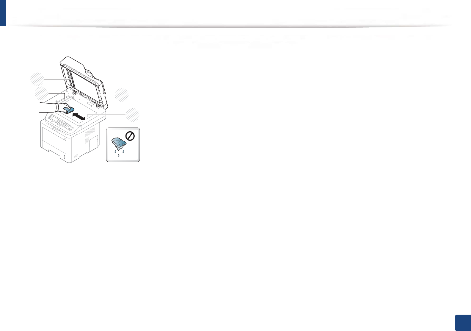 • Use a dry lint free cloth when cleaning the inside of the machine, be careful not to damage the transfer roller or any other inside parts. Do not use solvents such