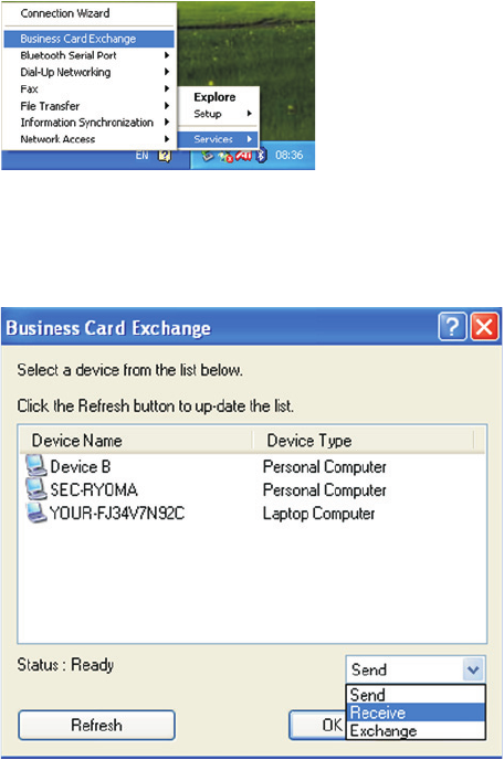 5. Choose the “Service > Business Card Exchange” menu of Samsung Bluetooth Tray