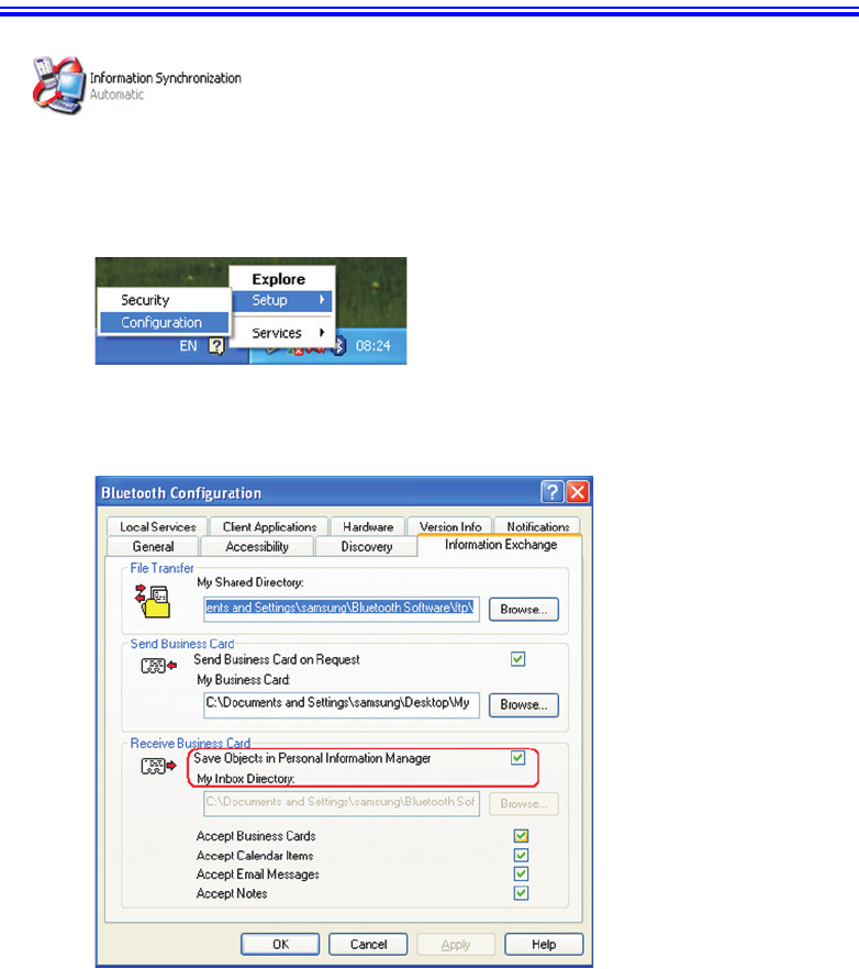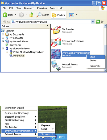 7. Select “Service > Information Synchronization” menu of the Samsung Bluetooth Tray