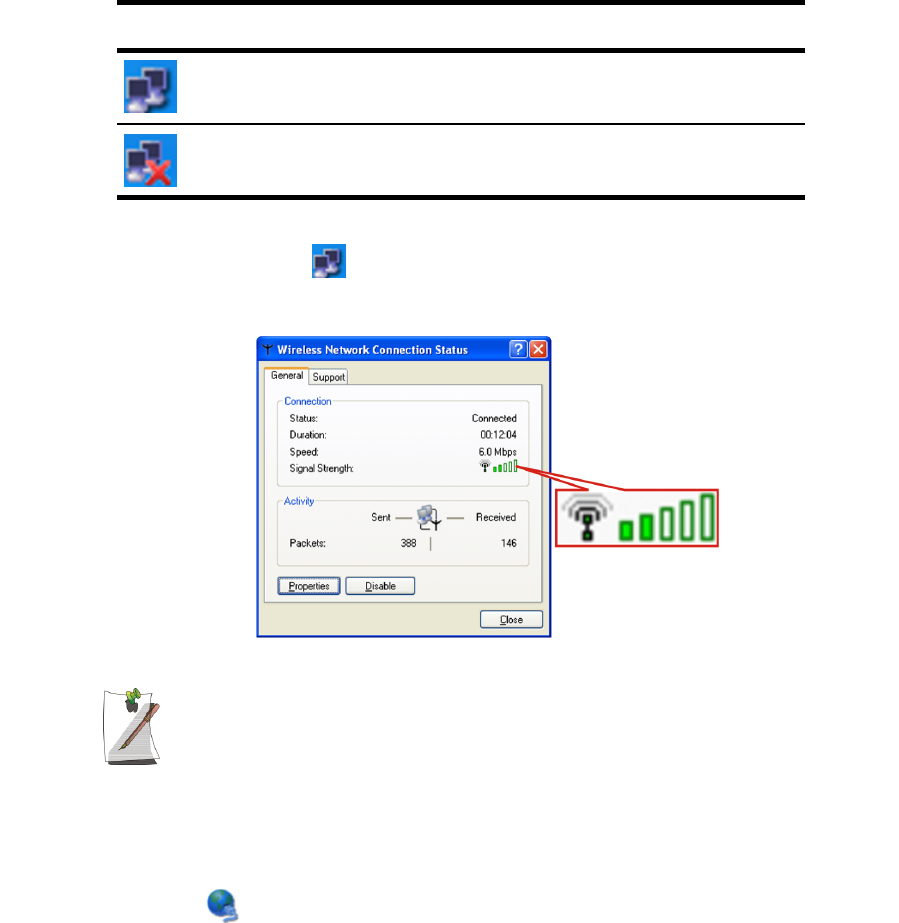 The table below shows the Windows taskbar icons for the wireless LAN.