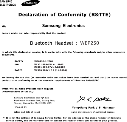 Samsung Electronics Co WEP450 Samsung WEP450 Bluetooth Headset User Manual WEP450
