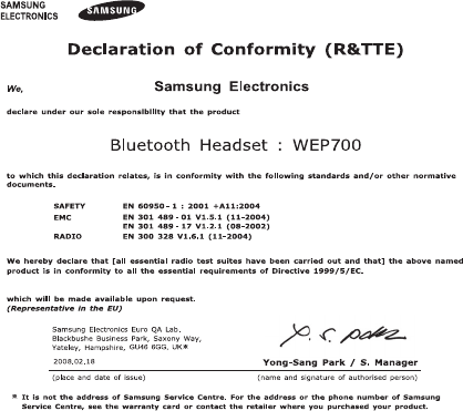 Samsung Electronics Co WEP800 Bluetooth Mono Headset User Manual WEP800