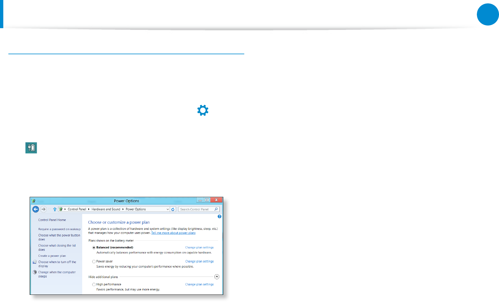 Control Panel > Hardware and Sound > Power Options.