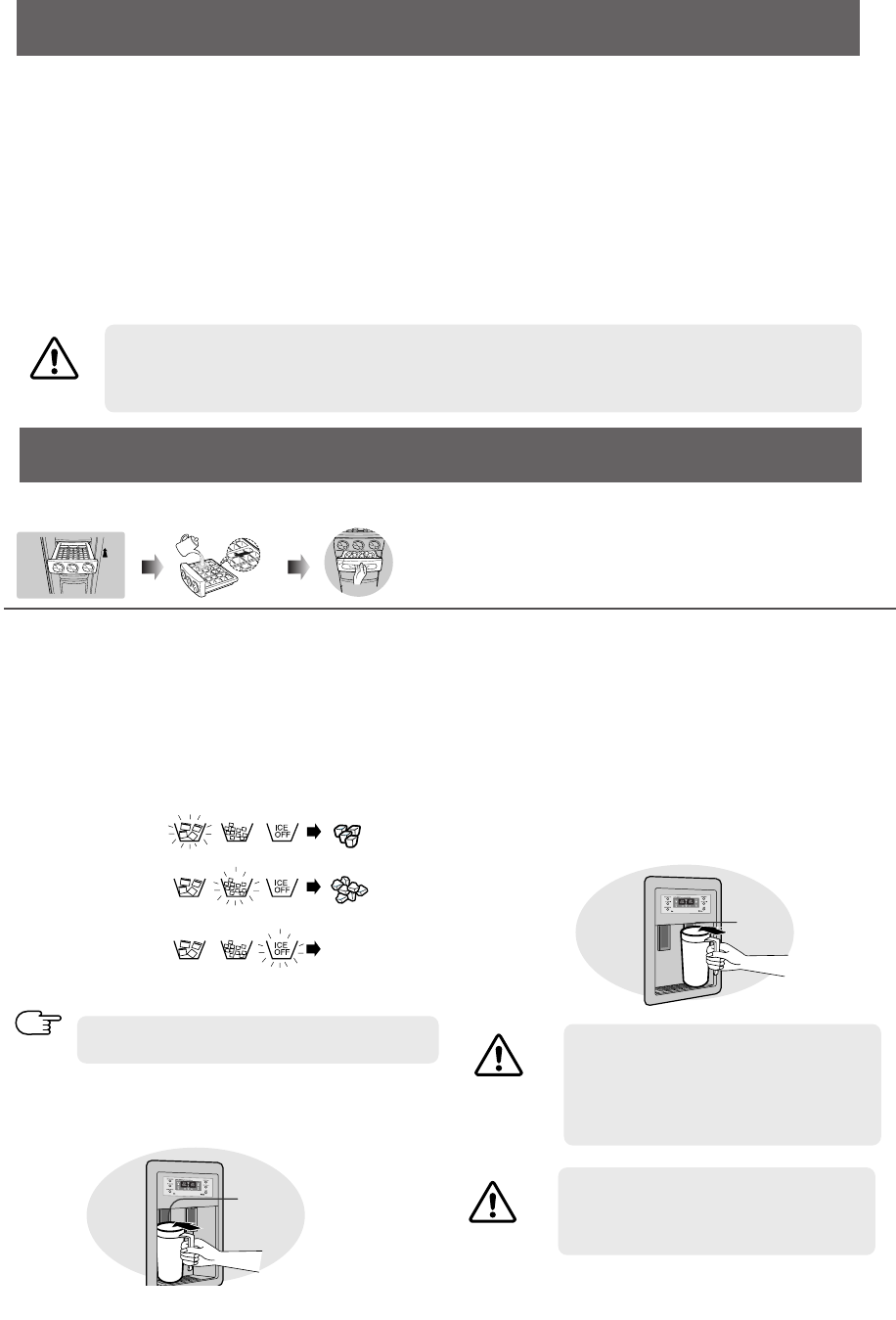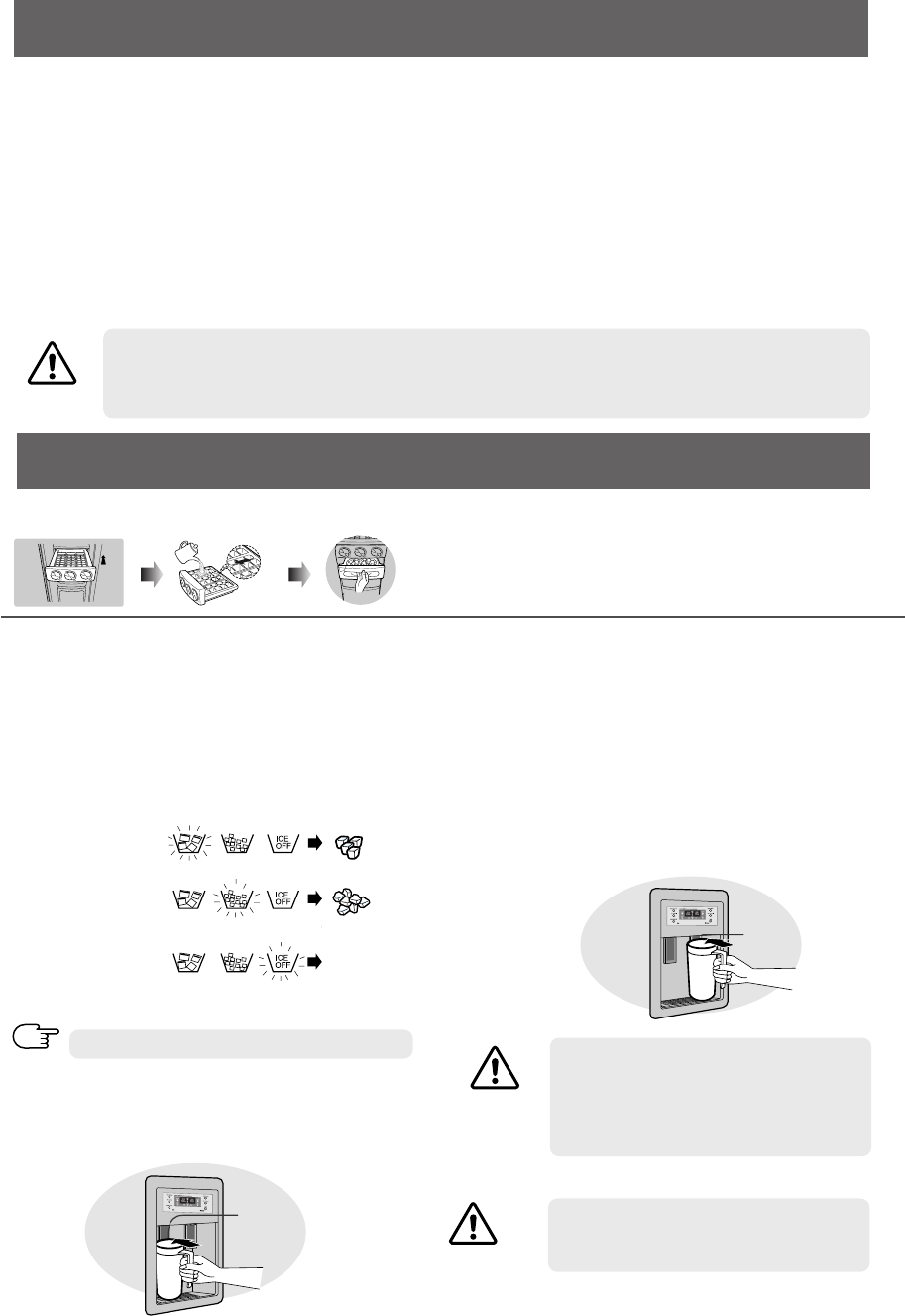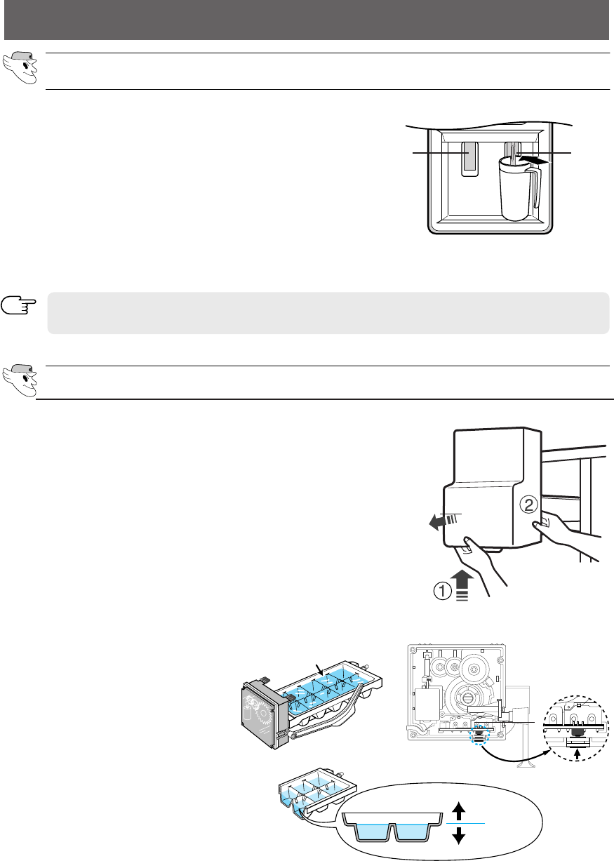 1) Nosta jääpalakonetta (①) ja vedä se ulos (➁) jääkaapista.