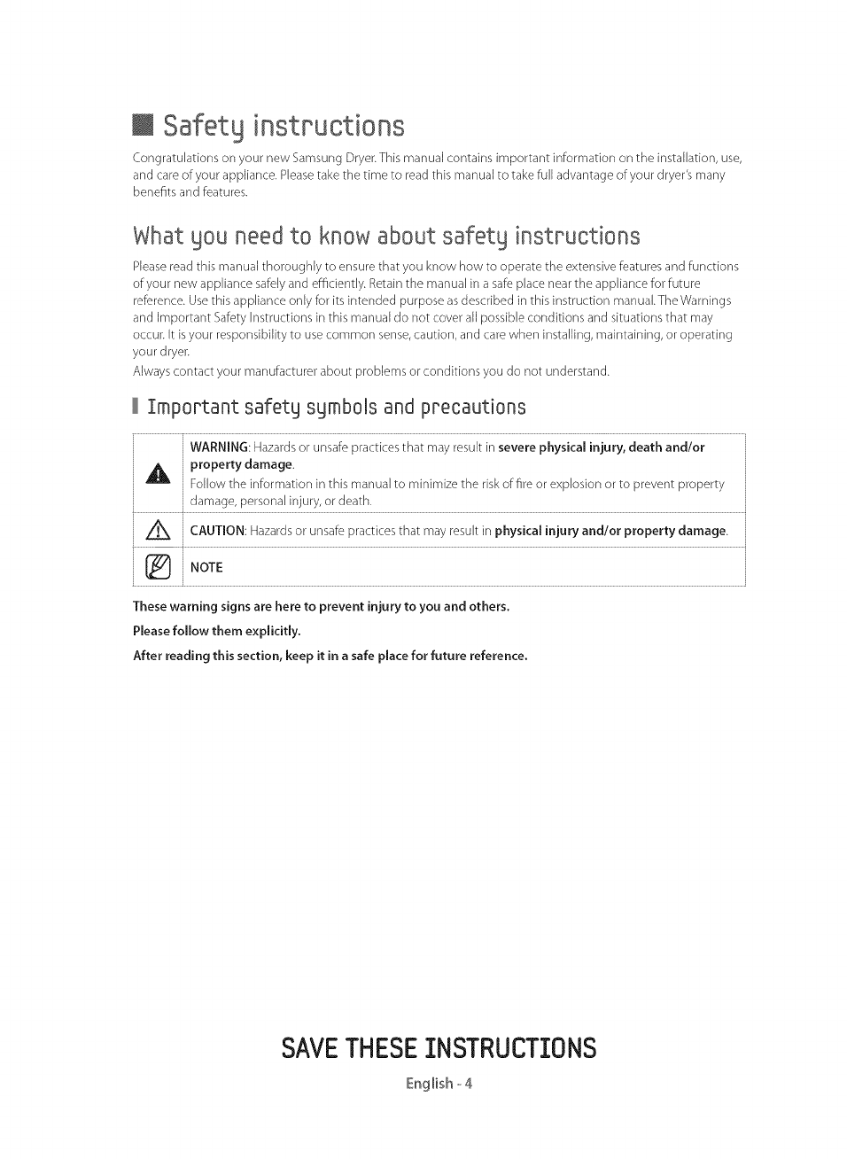 Congratulations on your new Samsung Dryer. This manual contains important information on the installation, use,