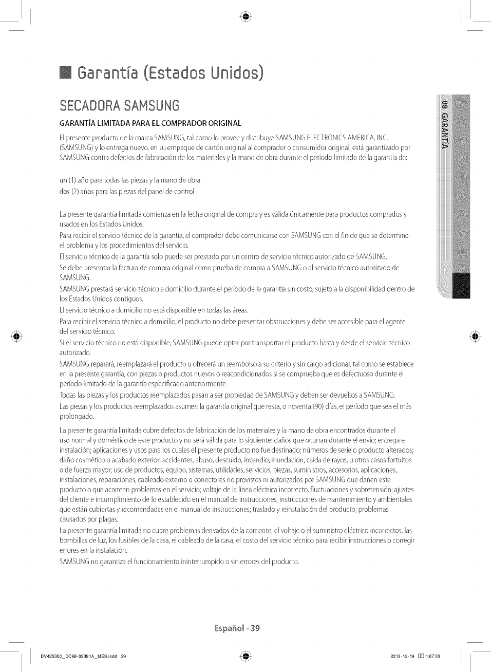 SAMSUNGprestar4 servkio td_cnicoa domicilio durante el perfodo de lagarantia sin costo, sujeto a la disponibilidad dentro