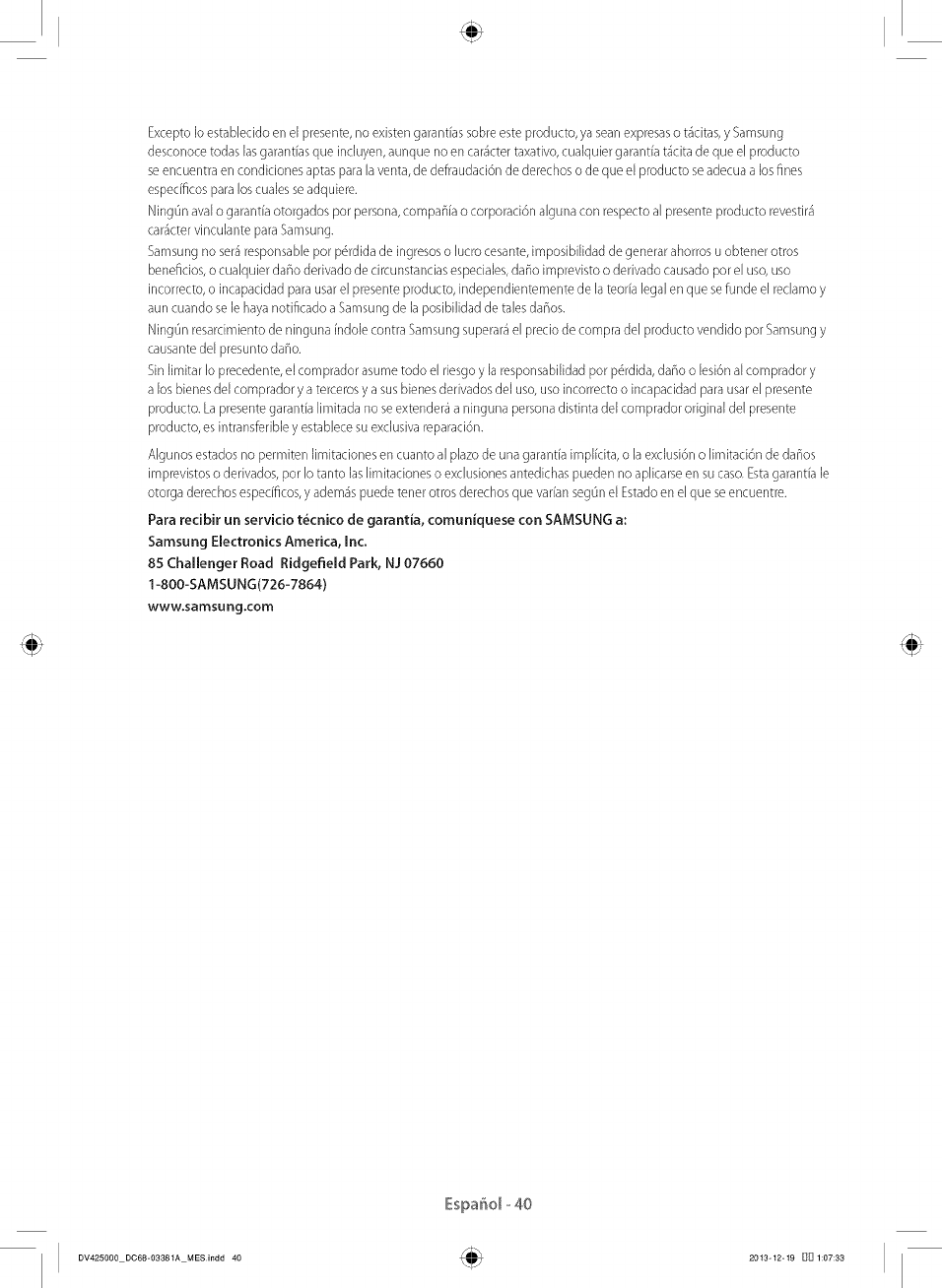 Para recibir un servicio t_cnico de garantJa, comunJquese con SAMSUNGa:
