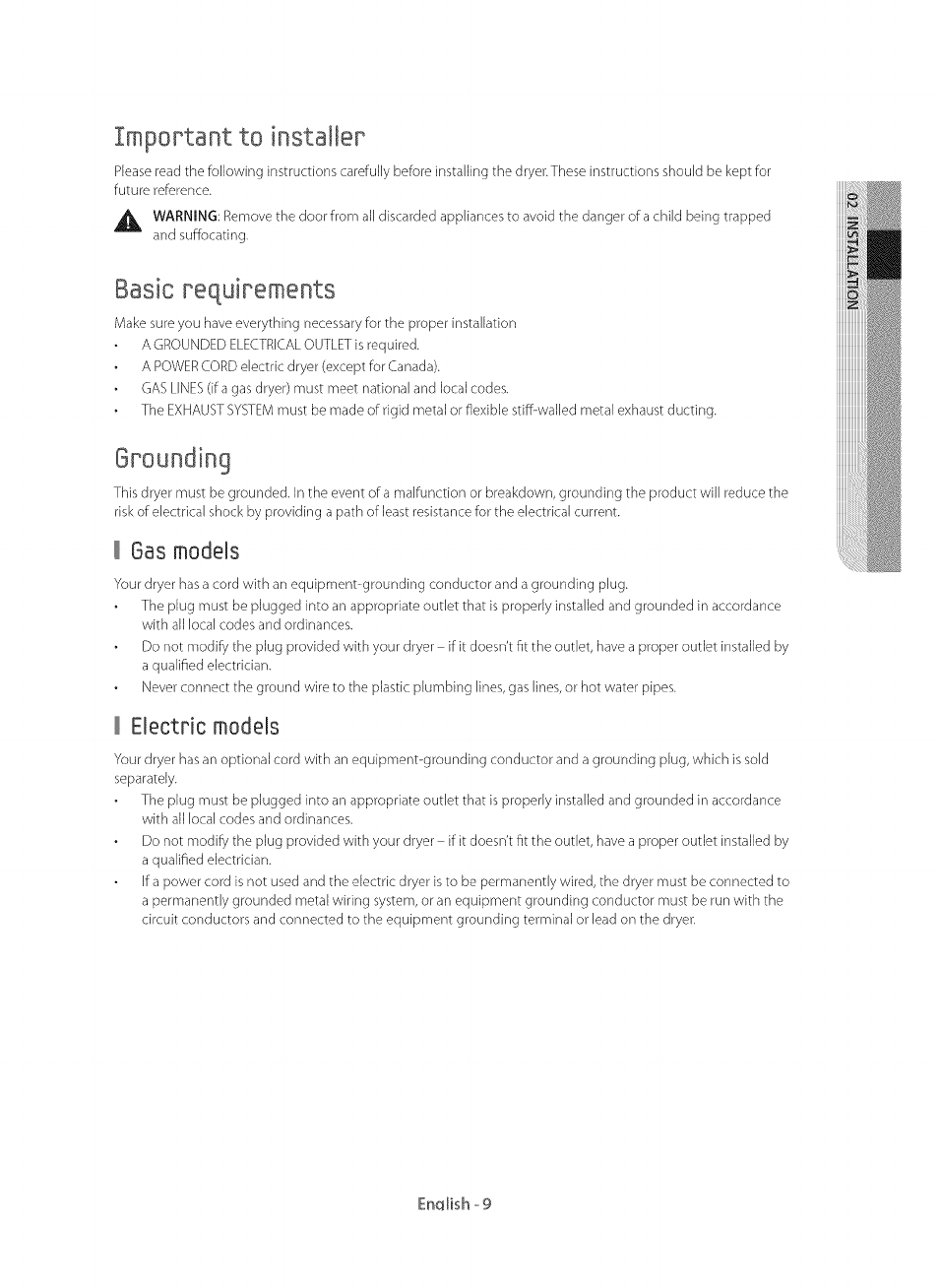 = • Clothes dryer installation must be performed by a qualified installer.