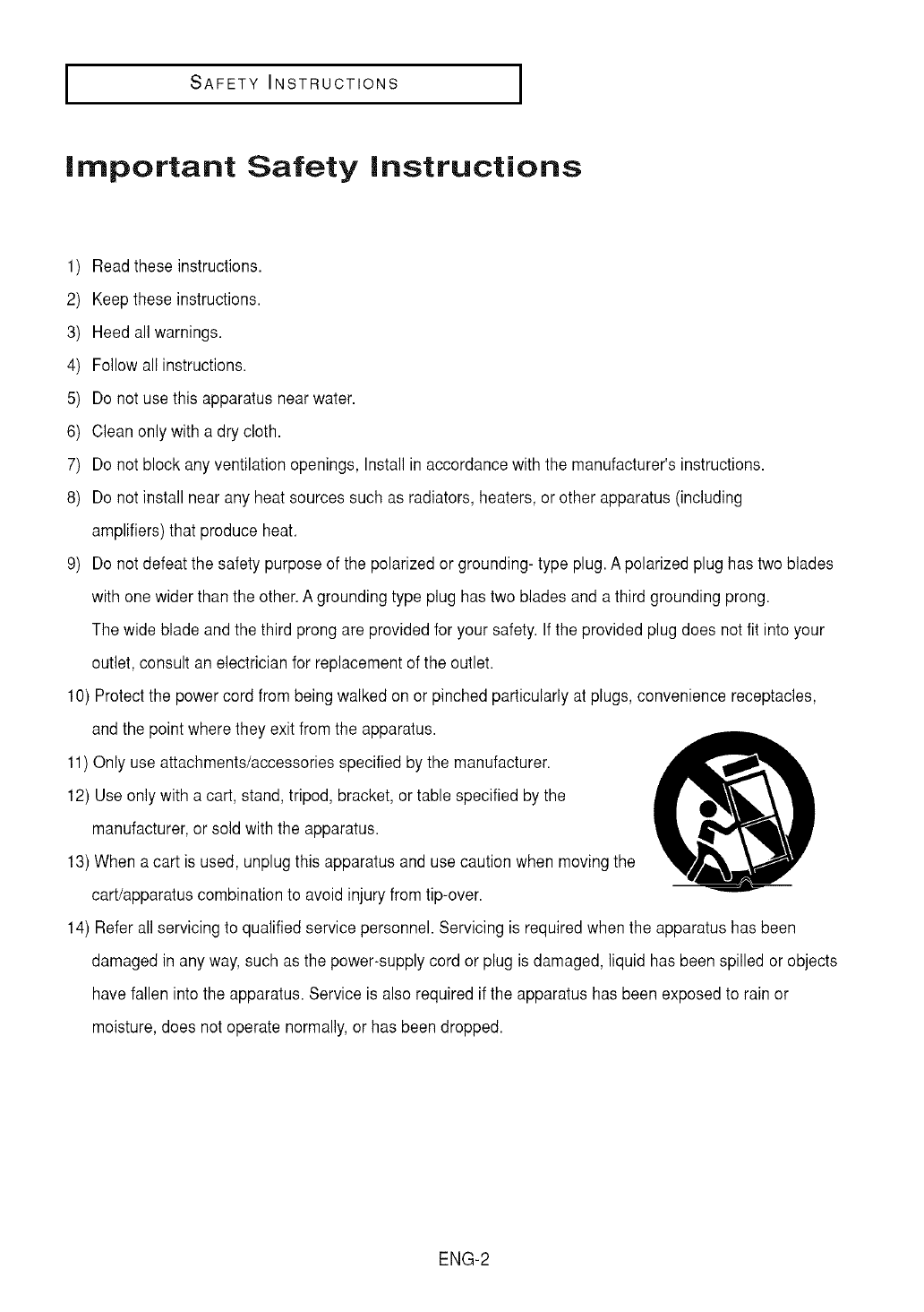 13)When a cart is used, unplugthis apparatus and use caution when moving the