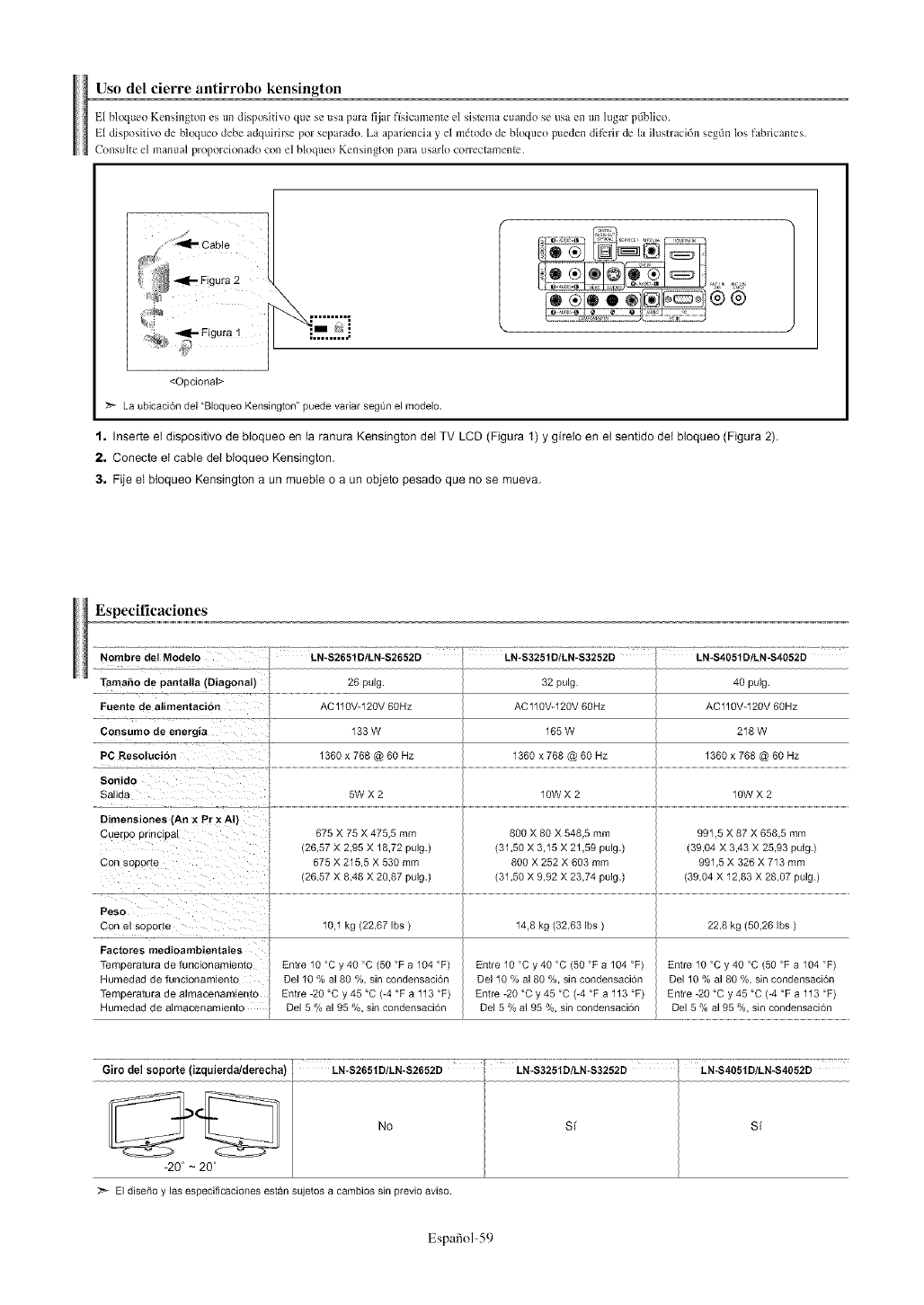 1, Inserte el dispositivo de bloqueo en la ranura Kensington del TV LCD (Figura 1) y girelo en el sentido del bloqueo (Figura 2),