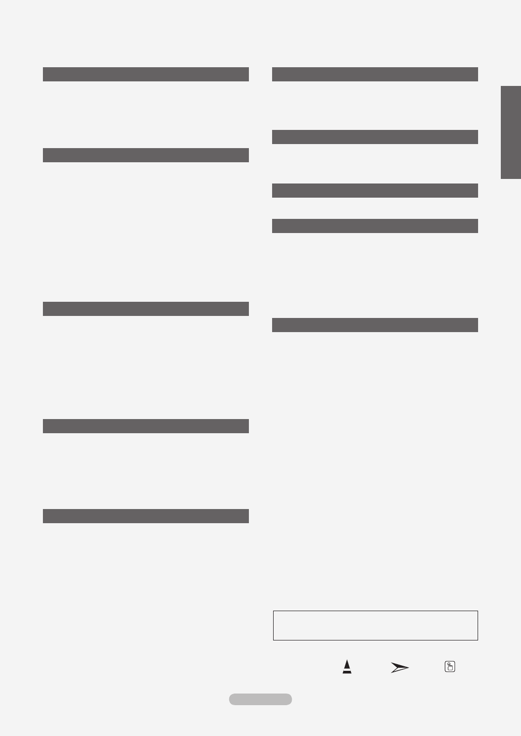 • Watching the LCD TV in 4:3 format for a long period of time may leave traces of borders displayed on the left, right and