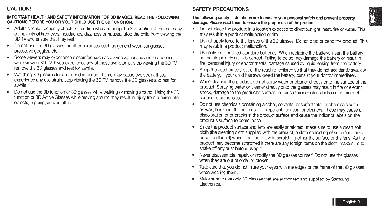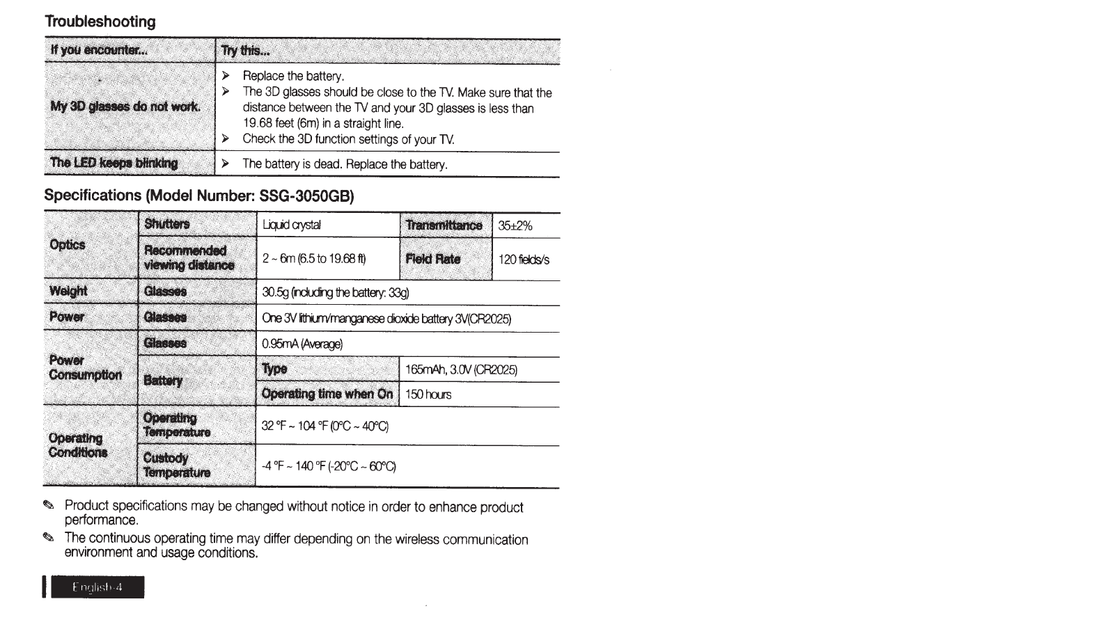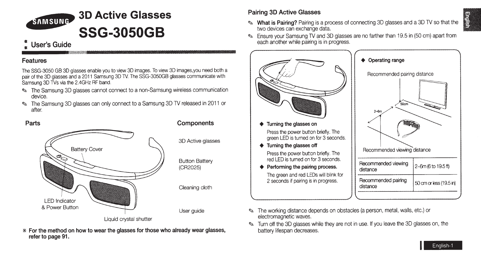 Samsung Ssg 3050Gb Active 3D Battery Glasses Users Manual 3053050GB