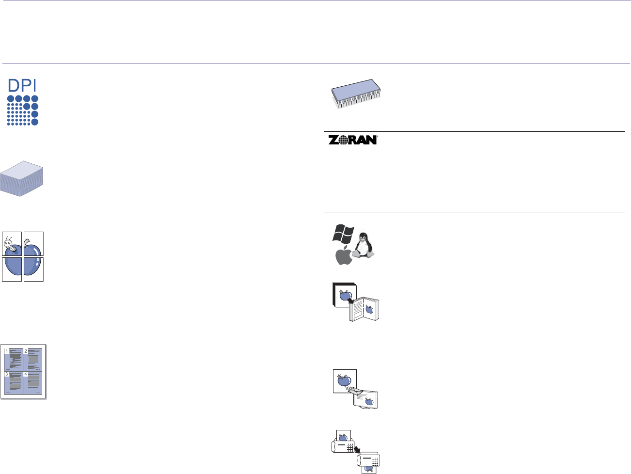 • Zoran IPS Emulation* compatible with PostScript 3 (PS)