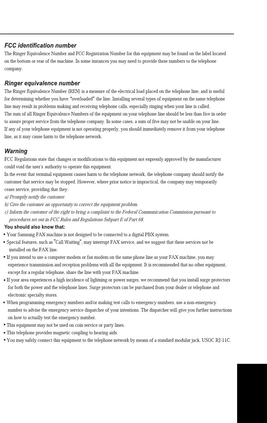 When using this fax machine, these basic safety precautions should always be followed to reduce risk of fire,