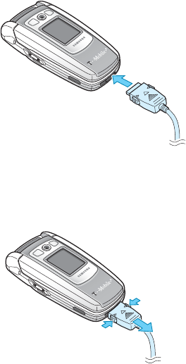 - 3. When charging is finished, unplug the charger from the power outlet and from the phone by pressing the gray tabs on both sides of the connector and pulling the connector out.