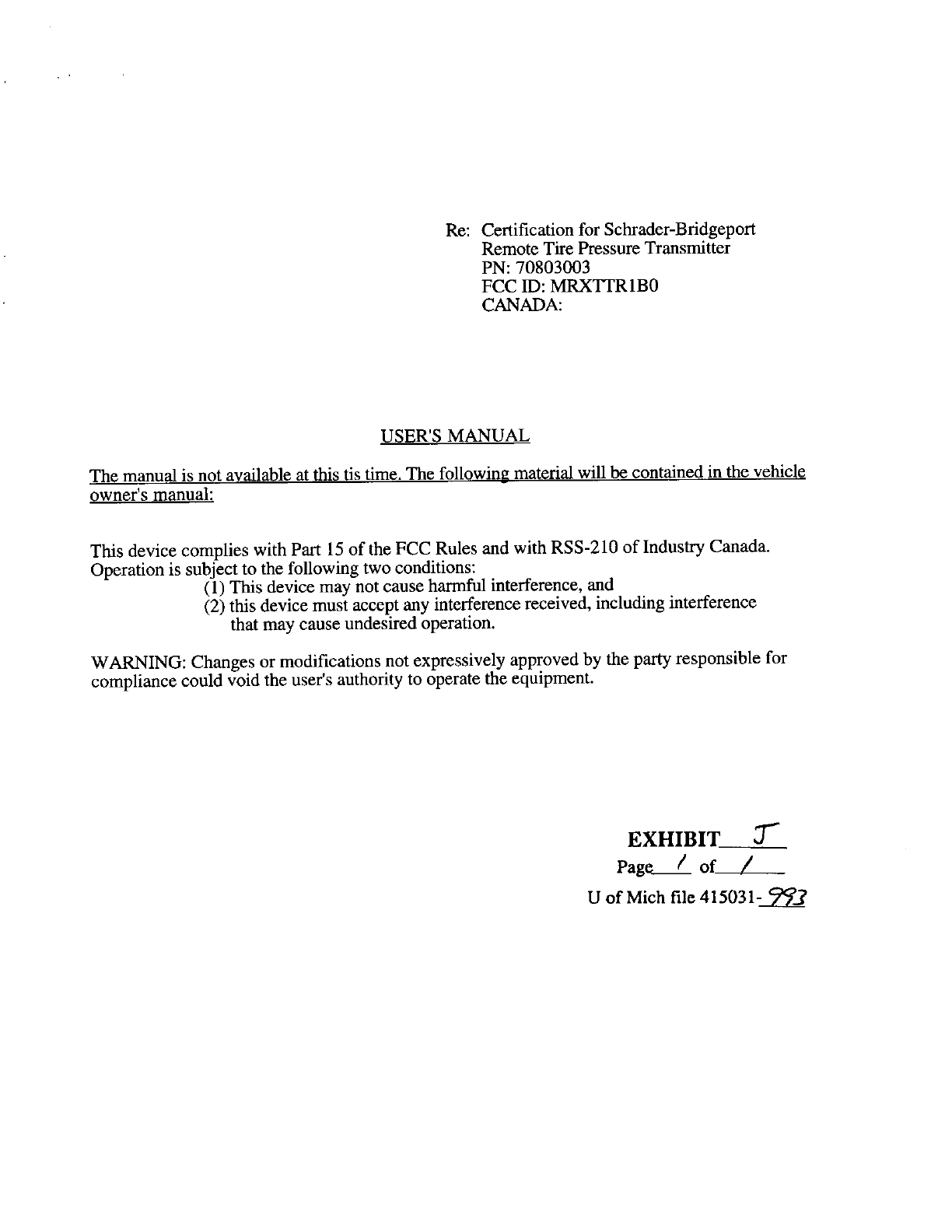 Schrader Electronics TTR1B0 User Manual 36121