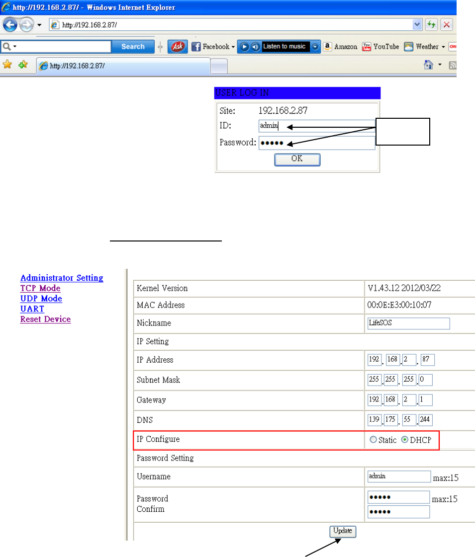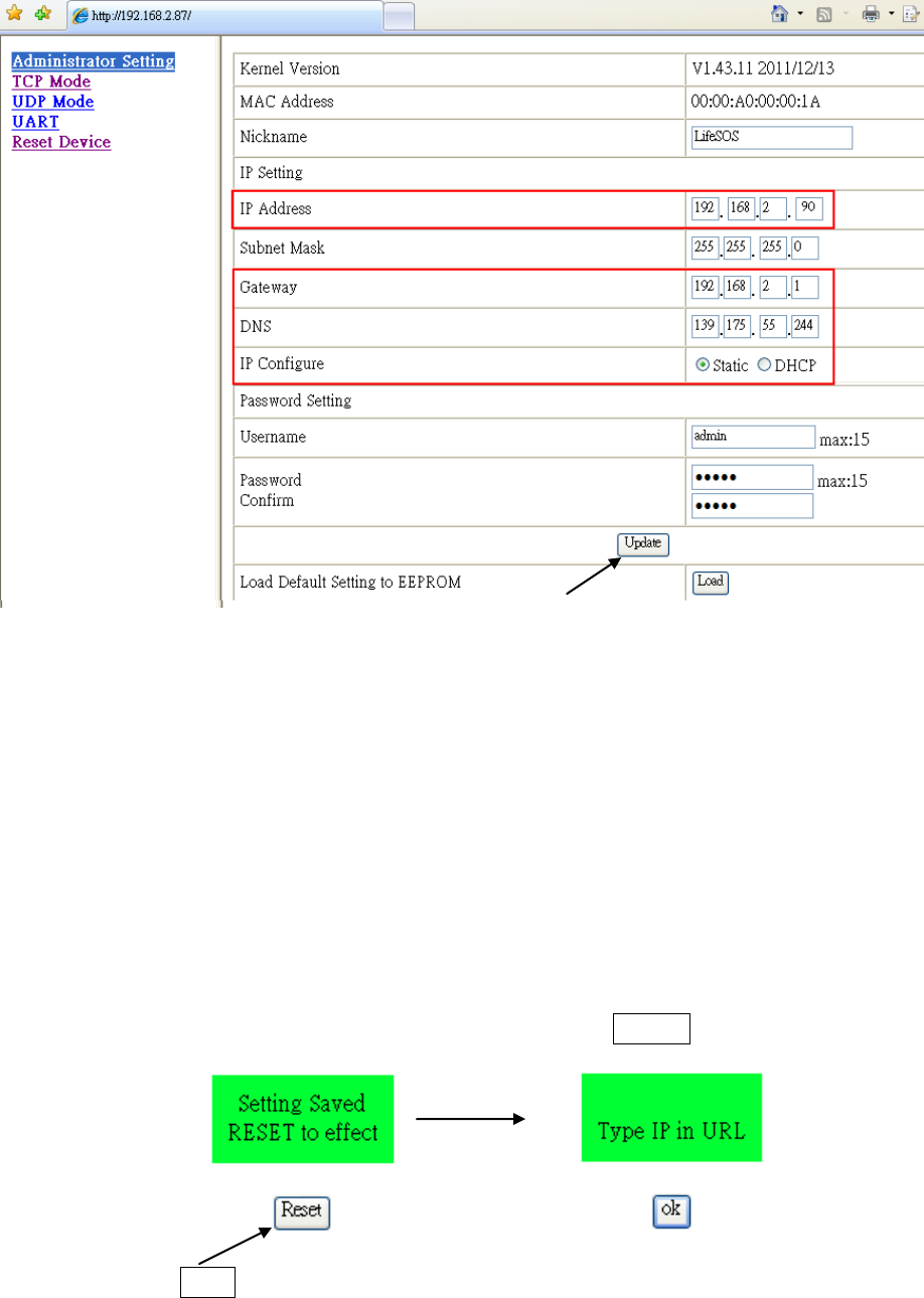 * The setup menu of Administrator Setting will be shown on the screen and change the “IP Configure”