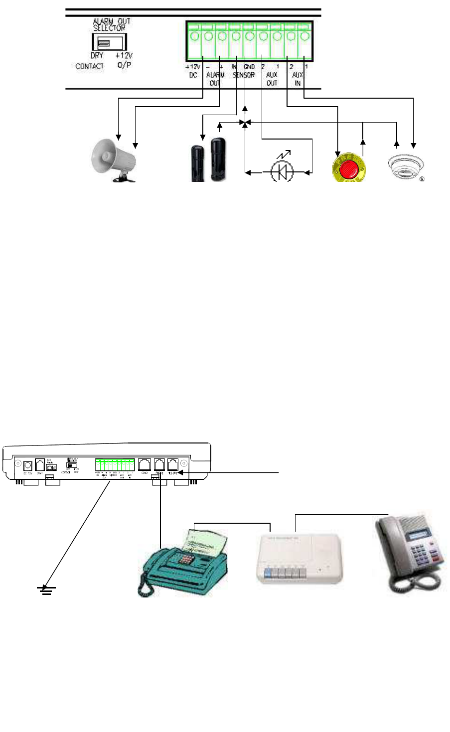 dry contacts or 9V~15V/GND output, depending on the setting of the ALARM OUT