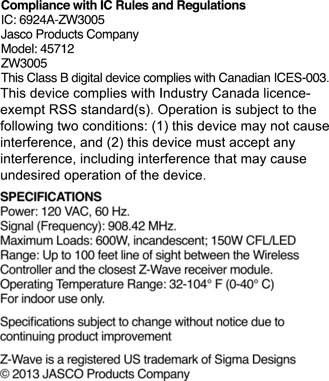 Seacomp Displays ZW3005 Wireless relay switch User Manual 45712 English Manual 052813