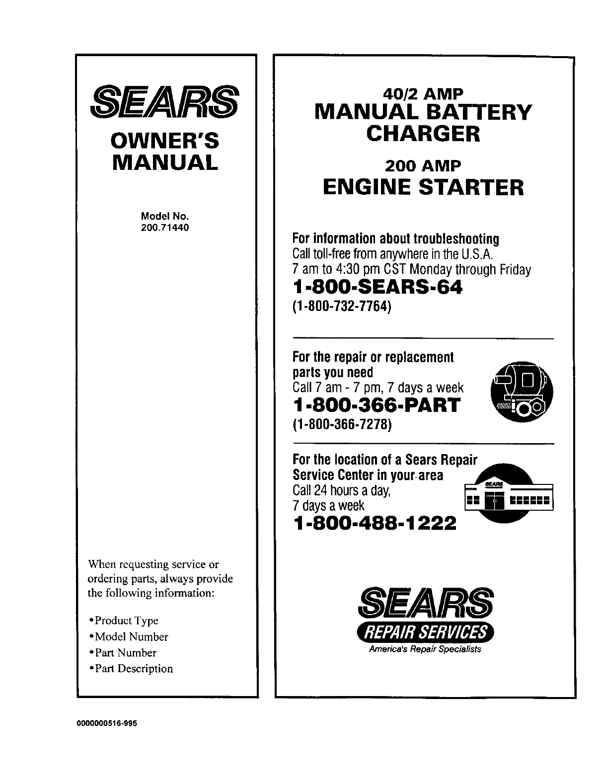 User Manual: Sears 20071440 20071440 SEARS Battery charger - Manuals and Guides View the owners manual for your SEARS Battery charger #20071440. Home:Automotive Parts:Sears Parts:Sears Battery charger Manual