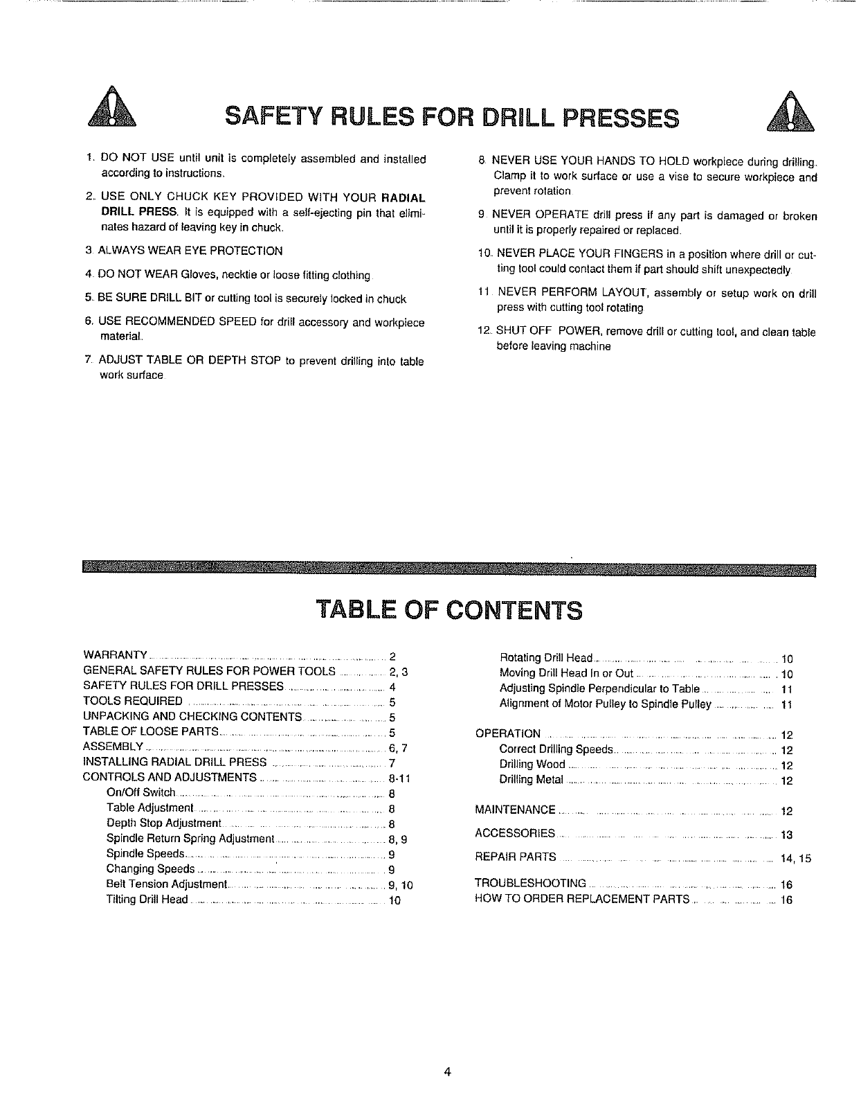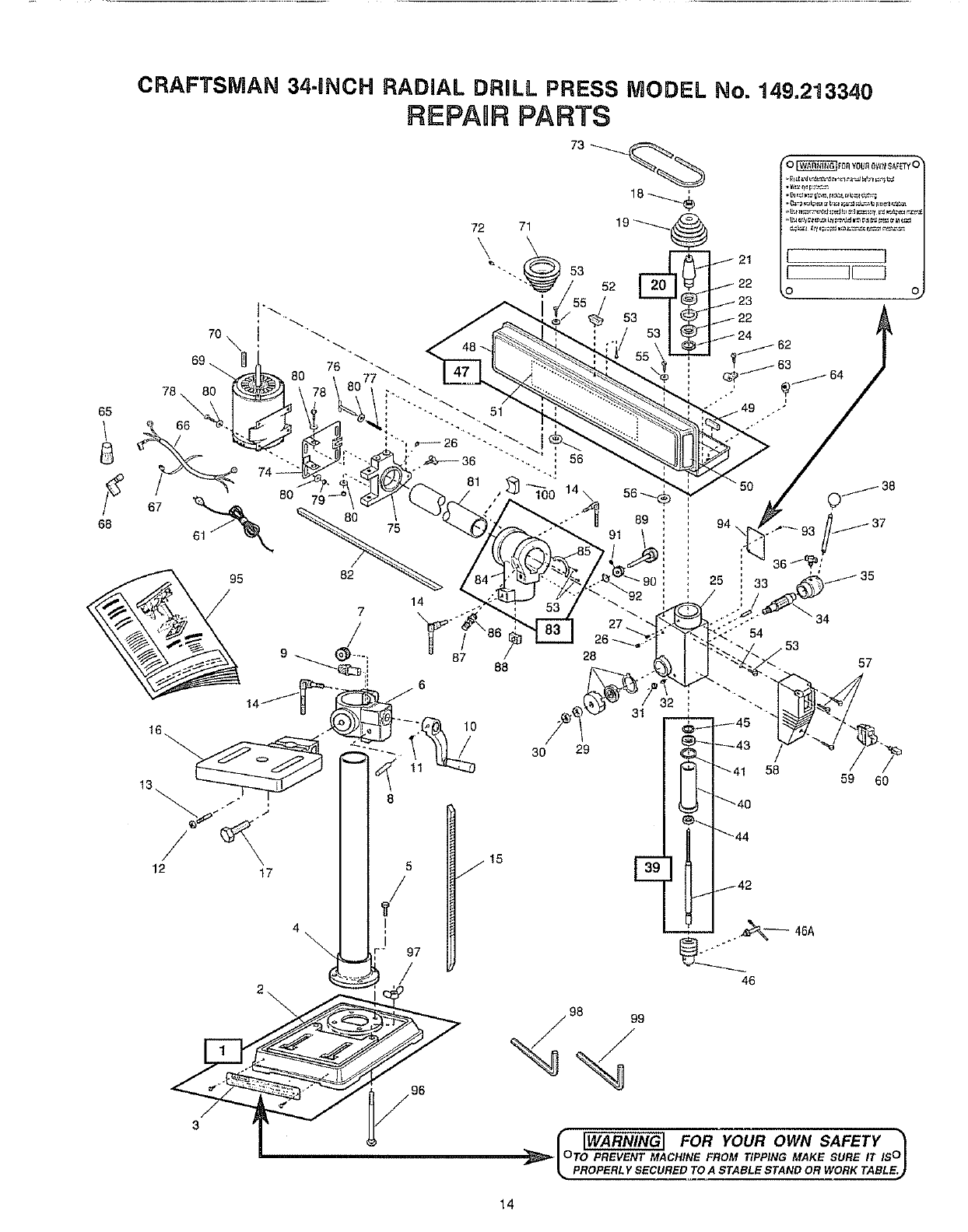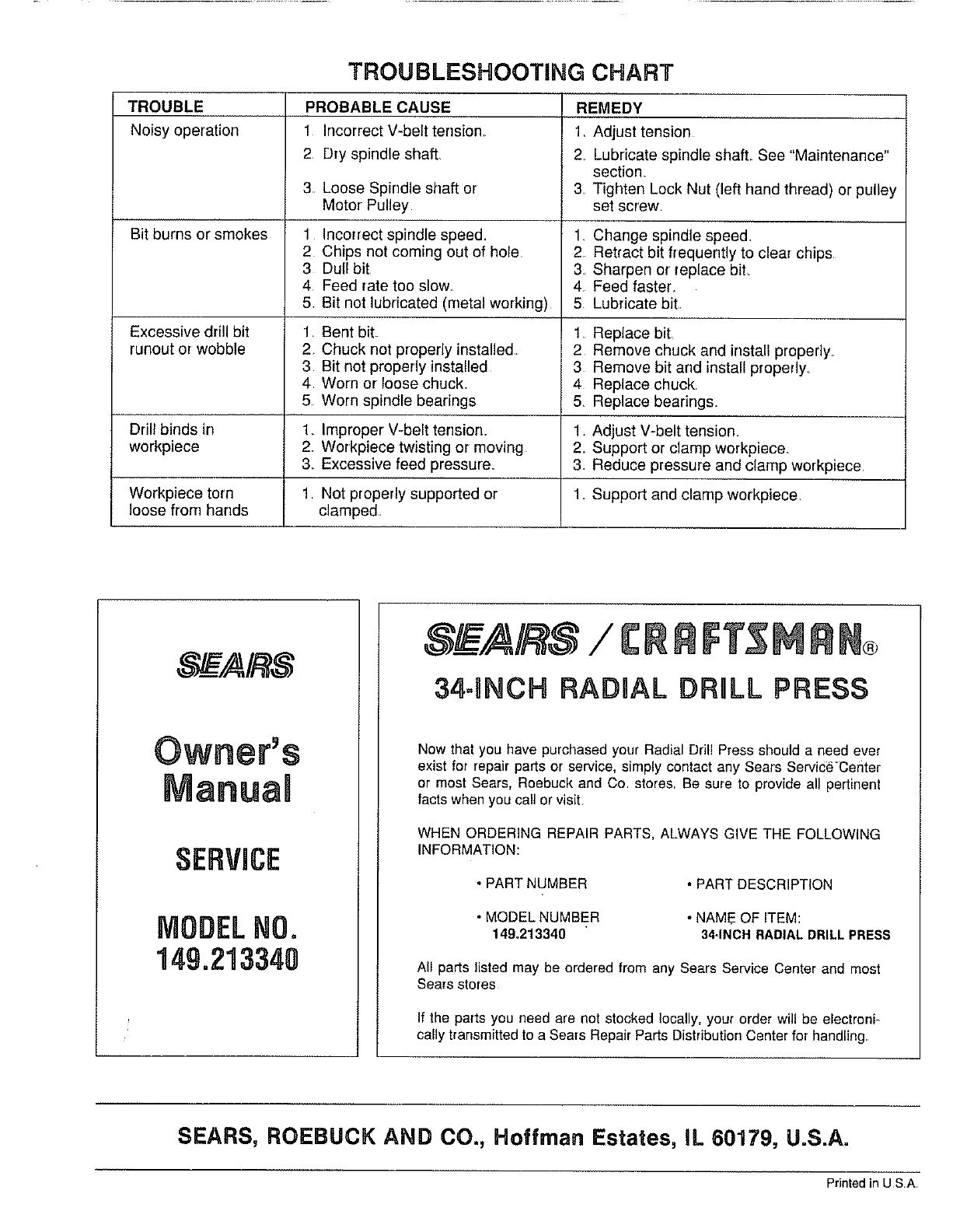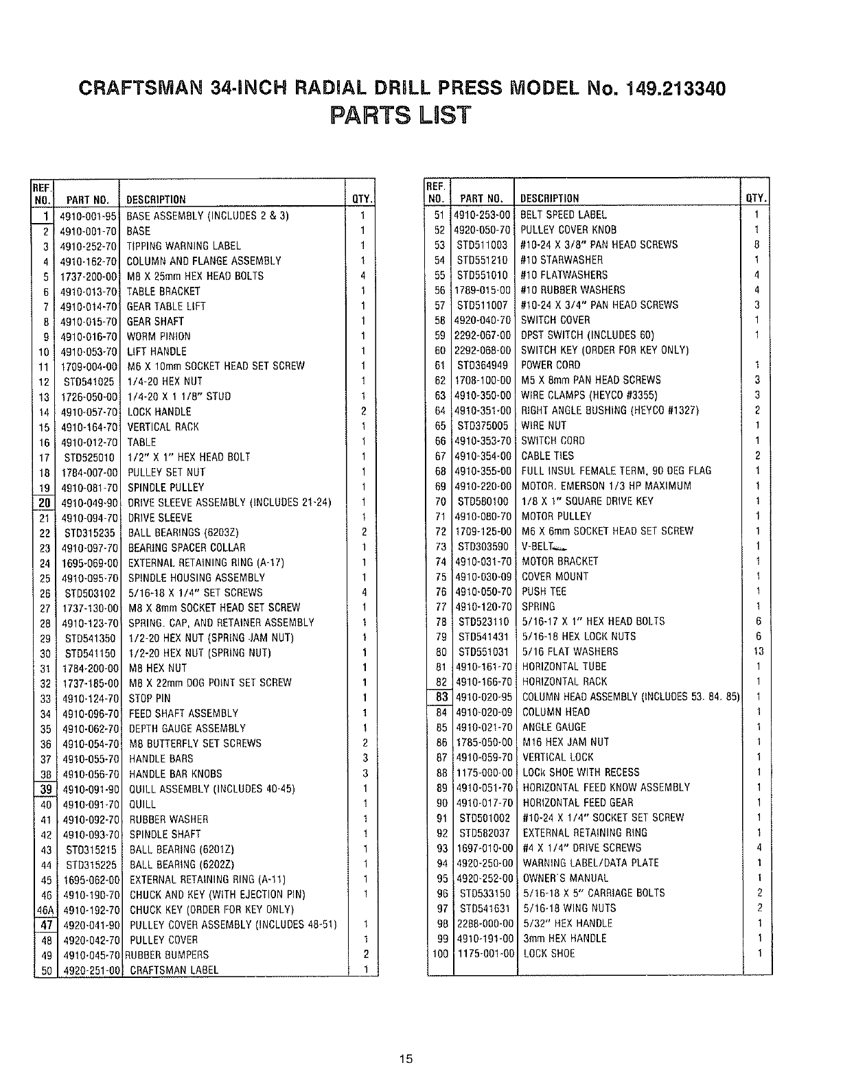 149213340 149213340 CRAFTSMAN RADIAL DRILL PRESS - Manuals and Guides L0807193 View the owners manual for your CRAFTSMAN RADIAL DRILL PRESS #149213340. Home:Tool Parts:Craftsman Parts:Craftsman RADIAL DRILL PRESS Manual