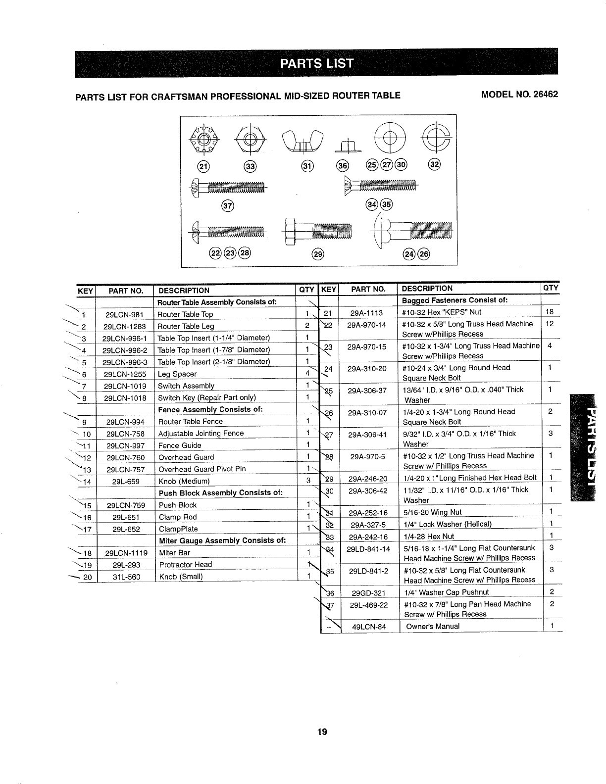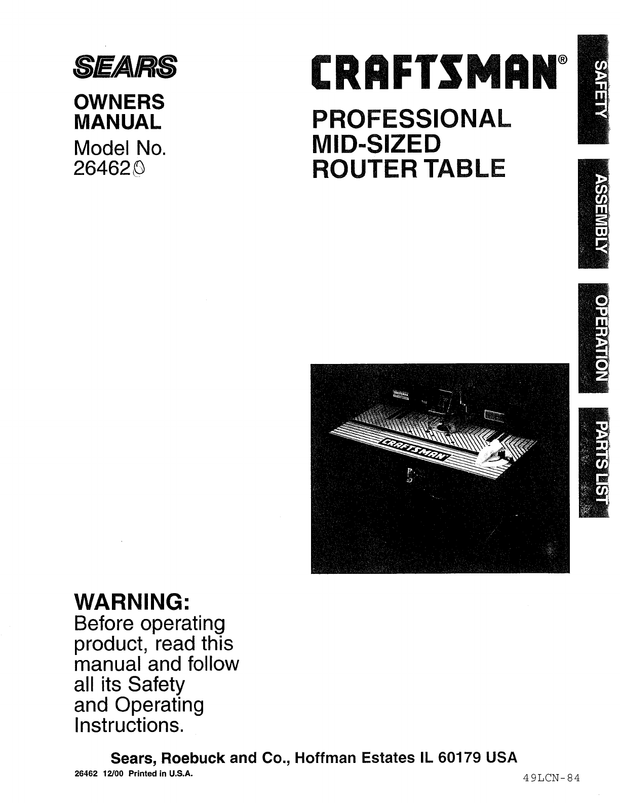 171264620 171264620 CRAFTSMAN ROUTER TABLE - Manuals and Guides L0908370 View the owners manual for your CRAFTSMAN ROUTER TABLE #171264620. Home:Tool Parts:Craftsman Parts:Craftsman ROUTER TABLE Manual