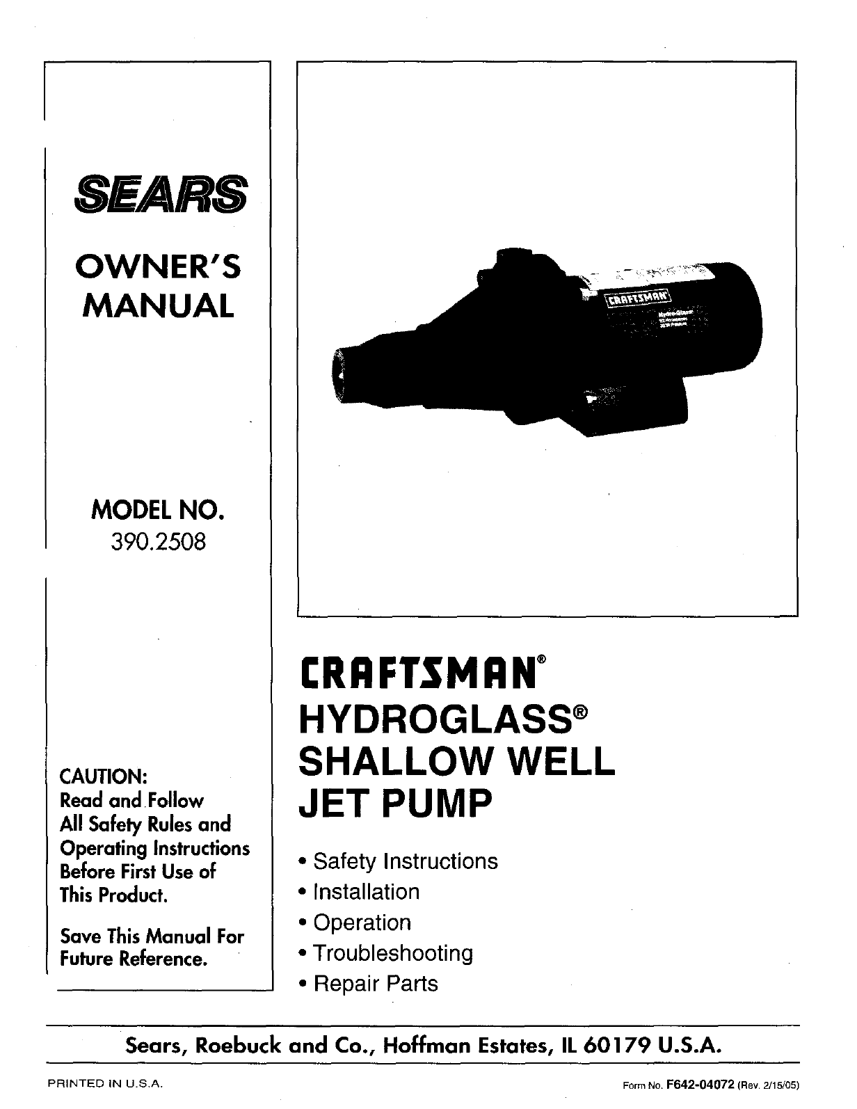 3902508 3902508 CRAFTSMAN JET PUMP - Manuals and Guides L0511301 View the owners manual for your CRAFTSMAN JET PUMP #3902508. Home:Plumbing Parts:Craftsman Parts:Craftsman JET PUMP Manual